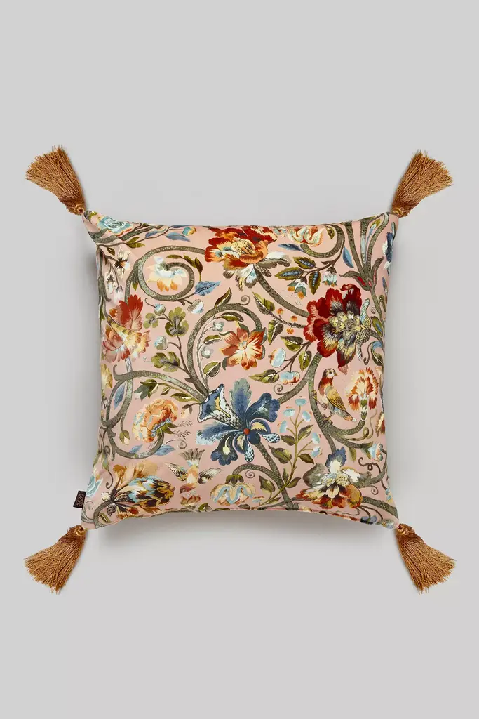 Linen Blend Pillow With Bird, Flowers And Tassels - Multi