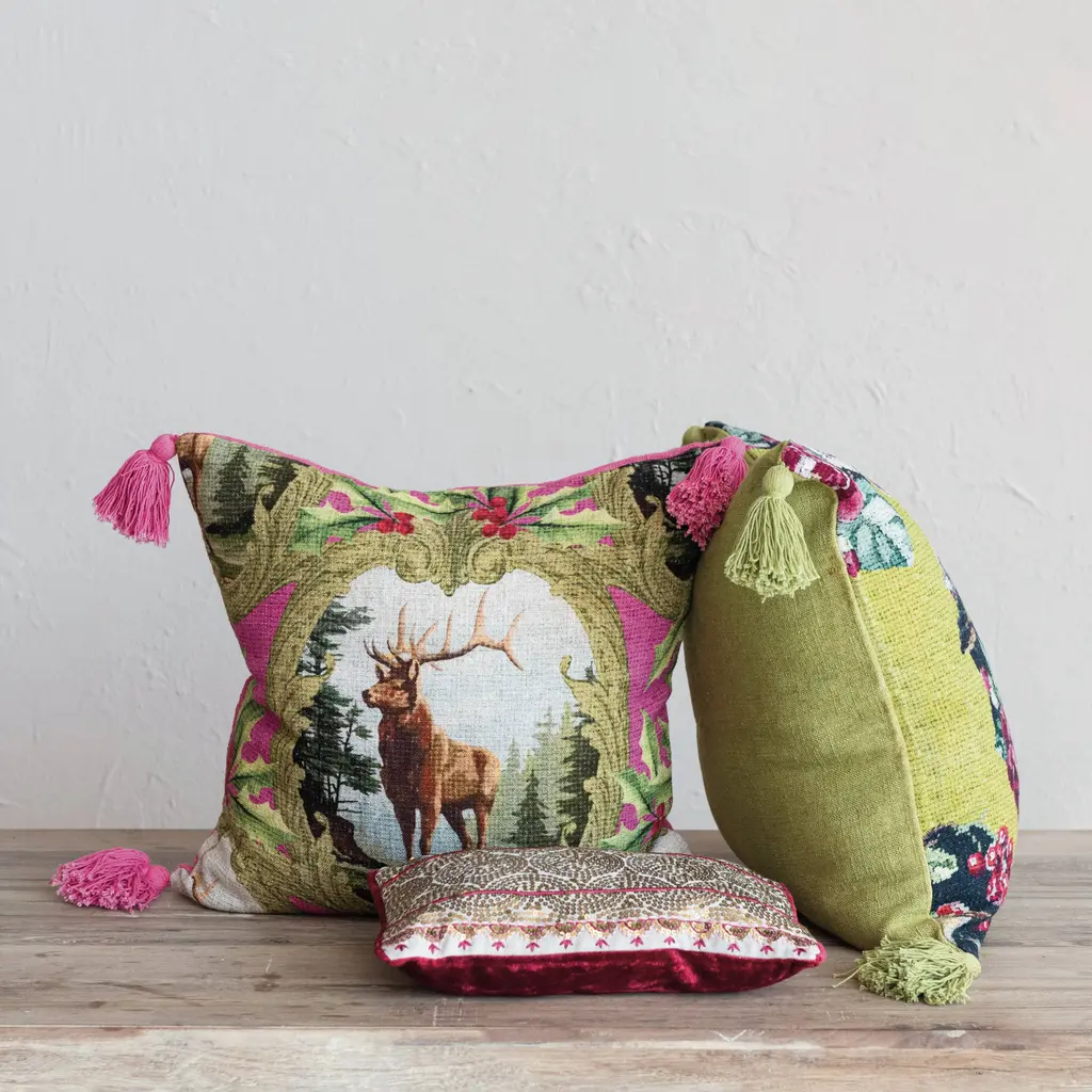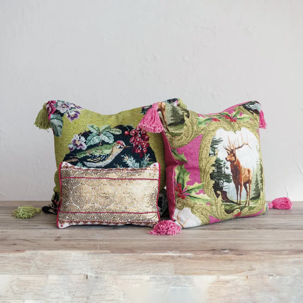 This 20-inch square woven linen blend pillow is a vibrant centerpiece, boasting a lively bird and floral pattern that brings a burst of life to any space. The multicolor design is complemented by tassels that add a touch of whimsy and movement. The cover's viscose blend gives it a lustrous finish, while the polyester fill ensures comfort and durability. Its ample size makes it an excellent choice for both visual appeal and functional use, whether it's brightening up a sofa or gracing a favorite chair. The pillow's unique design and durable materials make it a versatile and eye-catching addition to any room. Features: