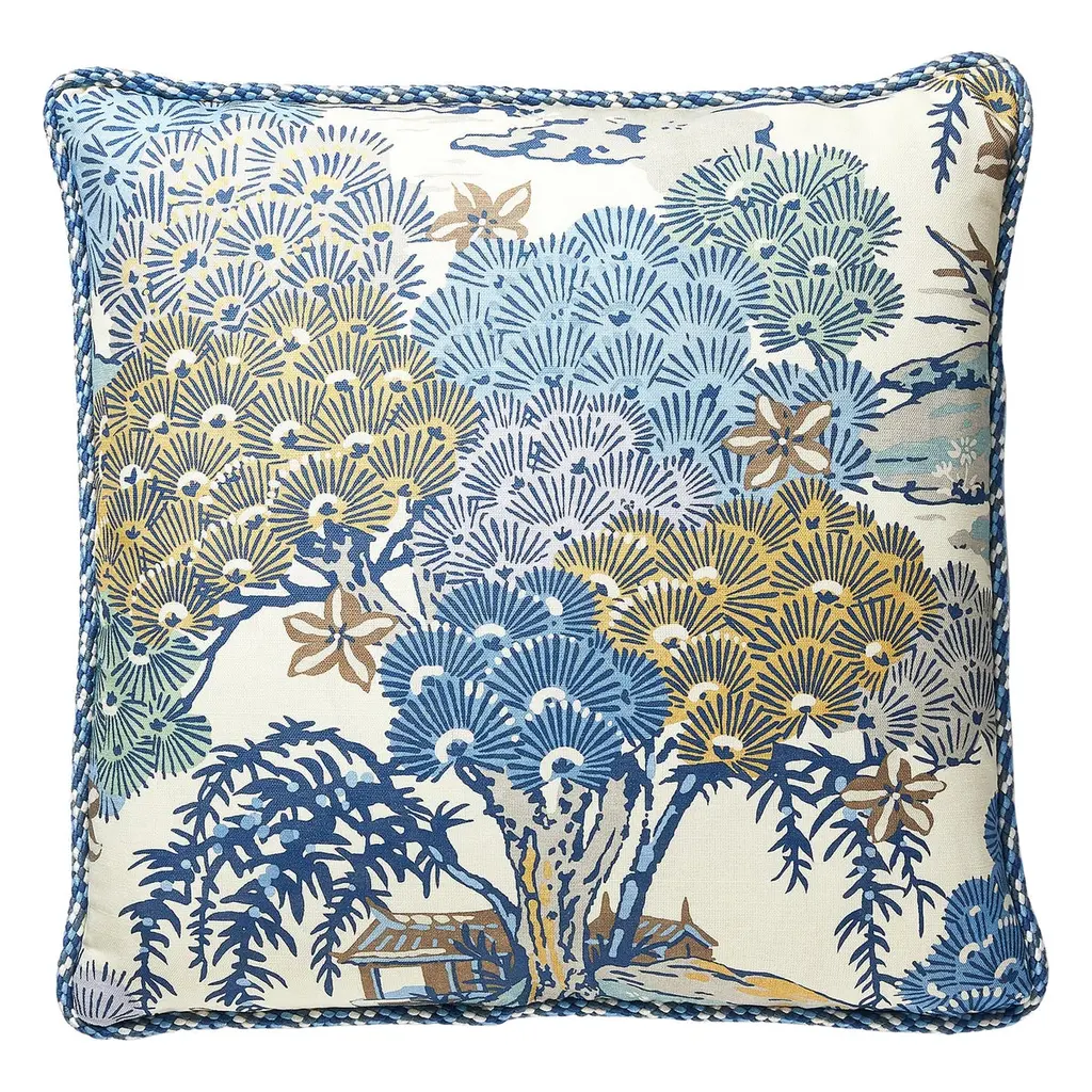 This soft linen-blend fabric pillow is printed with a watercolor style leaf design in deep indigo blue, marine blue and cream set against a taupe background. Gold metallic accents on the leaves catch the light and give the pillow a sophisticated flair. Size: 20"x20" Square Fabric: 55% Linen / 45% Rayon Same fabric and design on front and back Knife edge seams Hidden zipper closure Dry Clean Only Made in Canada: Designed and made in Pillow Decor's Vancouver workroom.