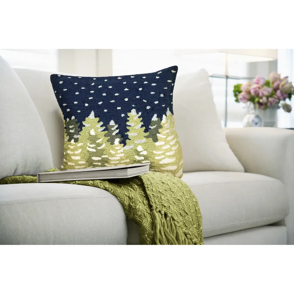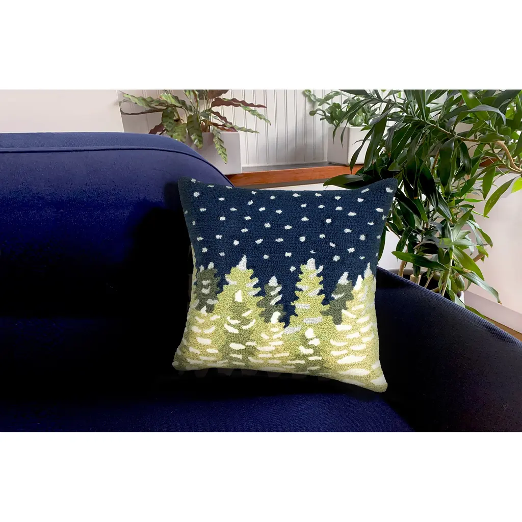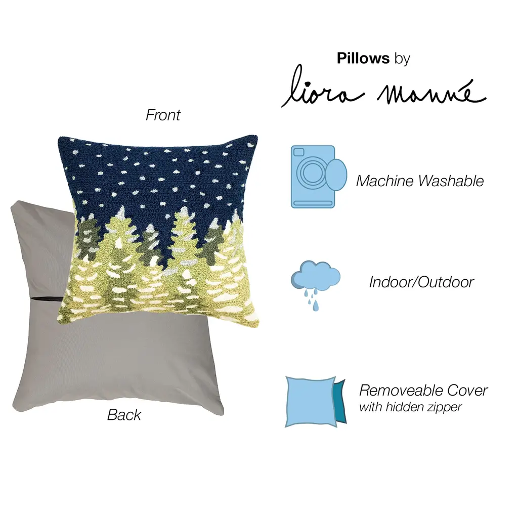Greet your guests with a serene winter door mat inspired by a peaceful snowfall on quiet winter trees. This hand hooked pillow is made with a tufted Polyacrylic face, a 100% Polyester back and a 100% Polyester insert making it suitable for indoor and outdoor use. It is easy-care and has a removable cover with a durable zipper closure. These playful and easy-care pillows will add character and visual interest to any area of your home. Care Instructions: Machine wash with mild detergent. Air dry flat. Do not use a hard bristle brush.