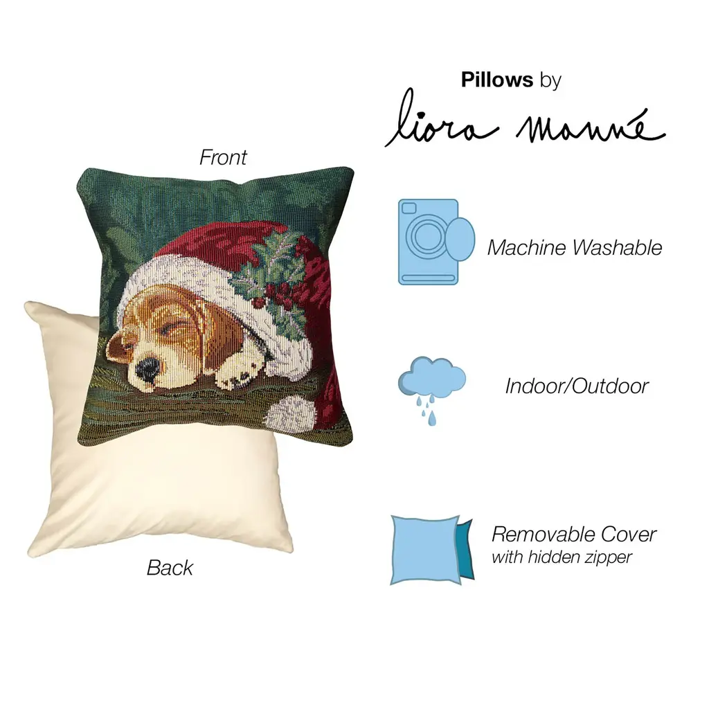 The Nap In A Cap novelty pillow features an adorable brown puppy sleeping snuggly nestled in a red Santa hat surrounded by holiday greenery.