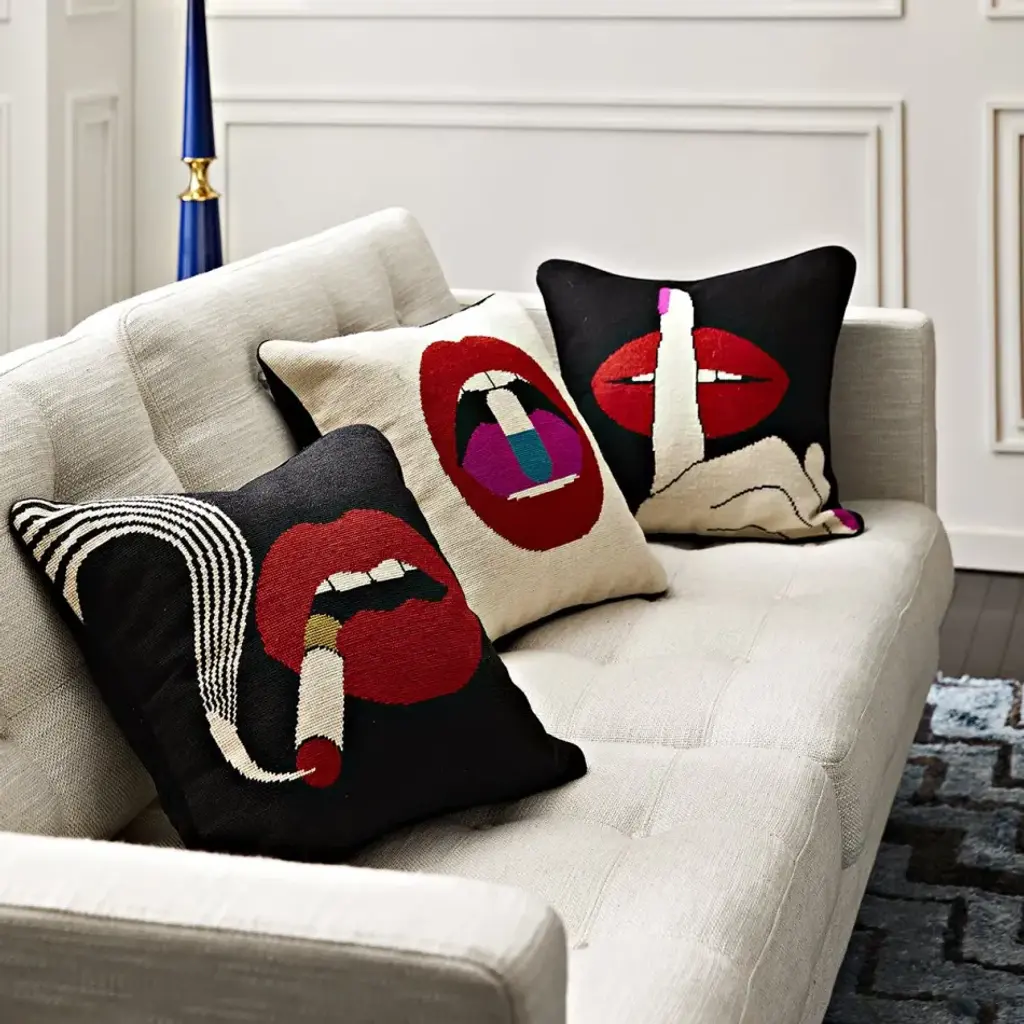 Trippy motifs put your sofa in a trance. Bold red lips demonstrate a trio of vices (or virtues, depending on who you ask). A marriage of traditional and Mod style, our Lips Needlepoint Pillows are the perfect punctuation for your pillowscape. Each is embroidered by hand and is backed in luxe velvet. Forget the fusty needlepoint of yore and embrace our sharp and chic world.