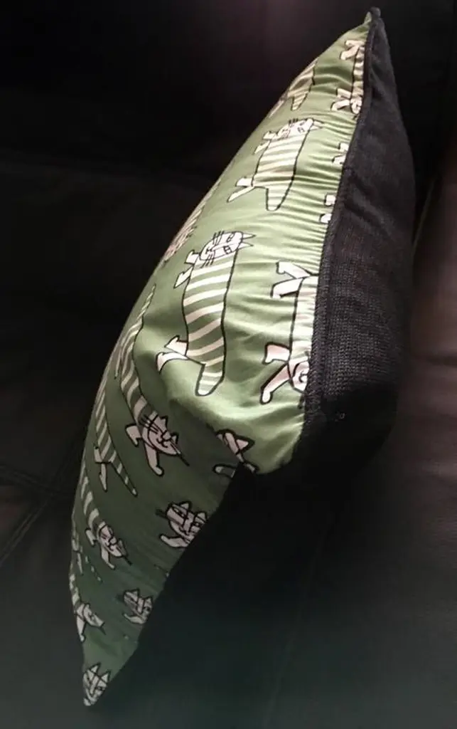 Cushions with zip on covers, fronts in 'Mikey' fabric designed by Lisa Larson, in typical Lisa Larson style, very reminiscent of her comical animal figures for Gustavsberg.
