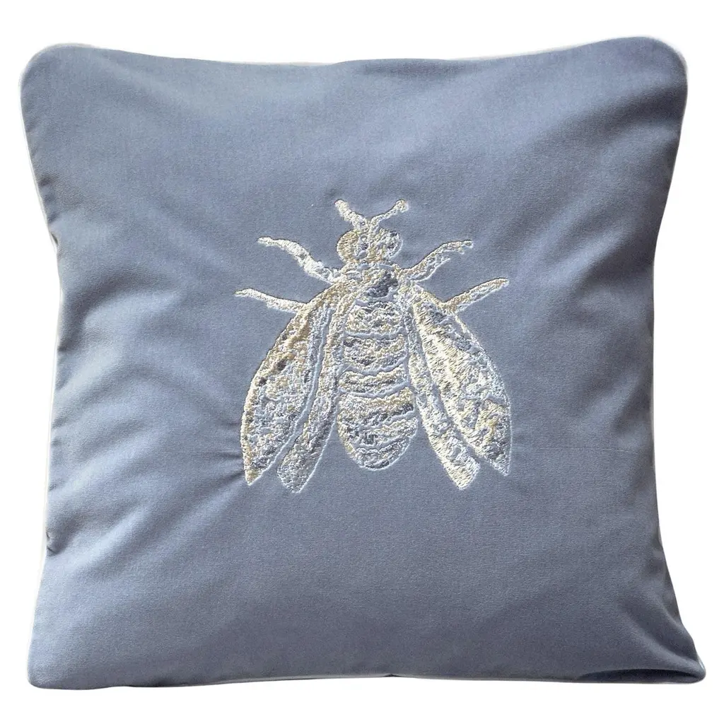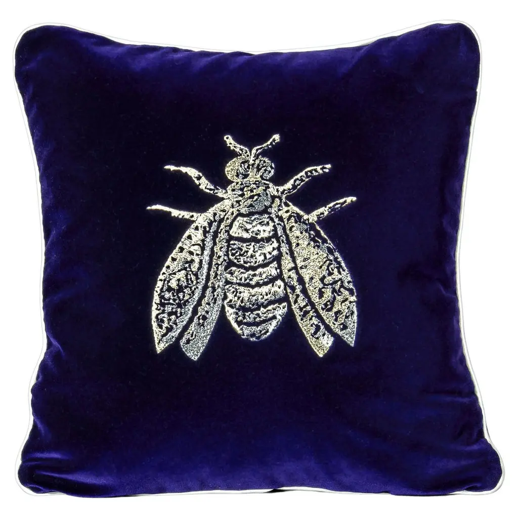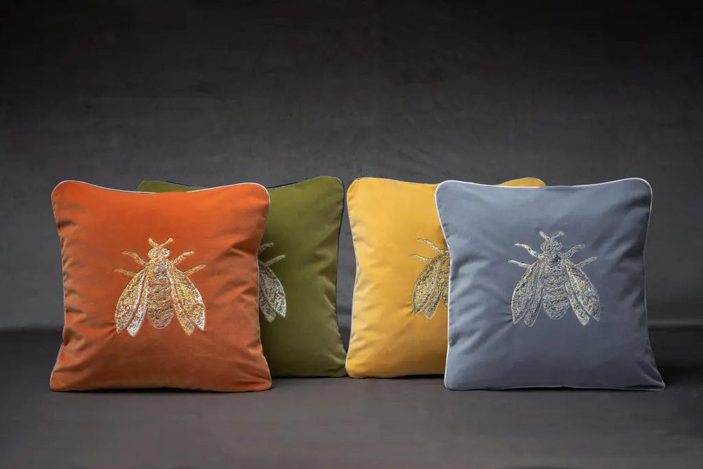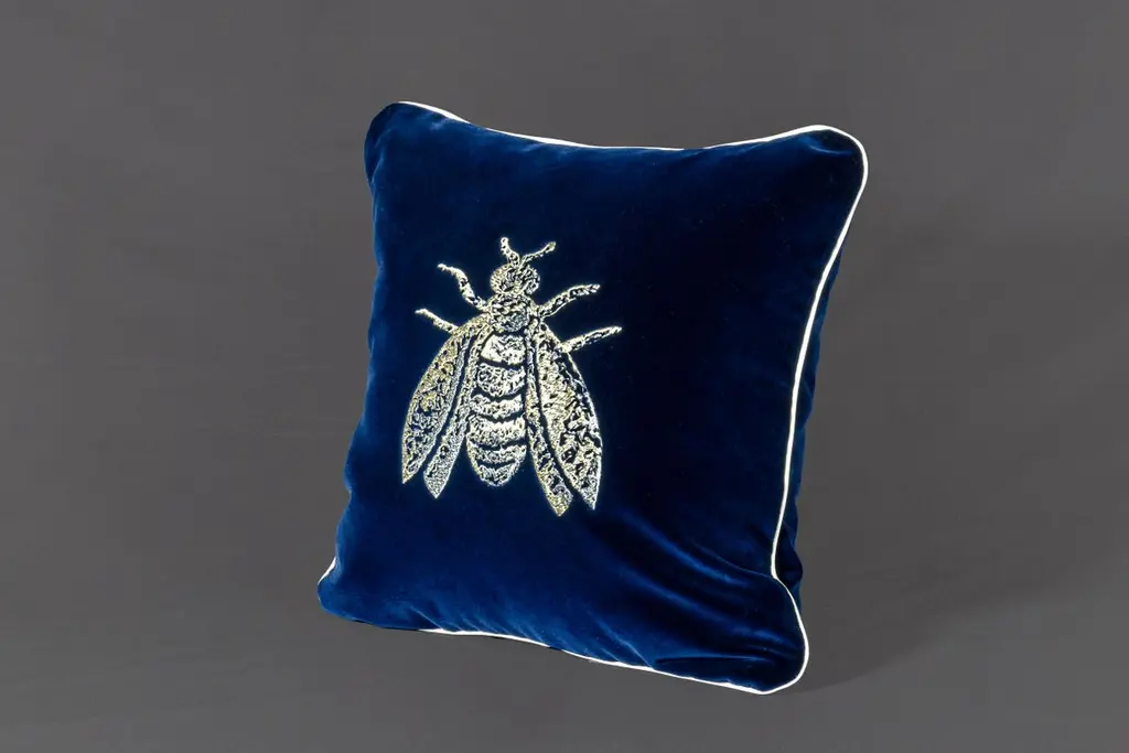 Our Bee pillow, embroidered on cotton velvet, is an exclusive piece of furniture that combines the elegance of the decorative pattern with the preciousness of the materials.The soft velvet provides a pleasant tactile sensation, while the original embroidery workmanship, done with special metallic luster yarns, recreates the effect of a metal foil corroded by time, giving a unique and sophisticated appeal.The absolute star of the pillow, the bee is a symbol of nature's harmony. Its pattern, made with a skillful interweaving of metallic yarns, gives a striking textural effect, enhanced by the contrast between the velvety surface and the brightness of the embroidery.A perfect blend of traditional craftsmanship and contemporary design, this pillow is not just a decorative accessory, but an authentic element of style, capable of enriching any room with refinement and personality.When ordering, please specify the desired color.