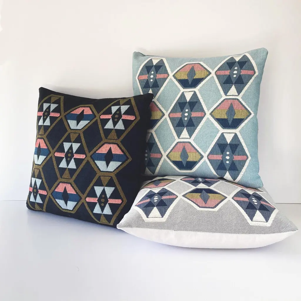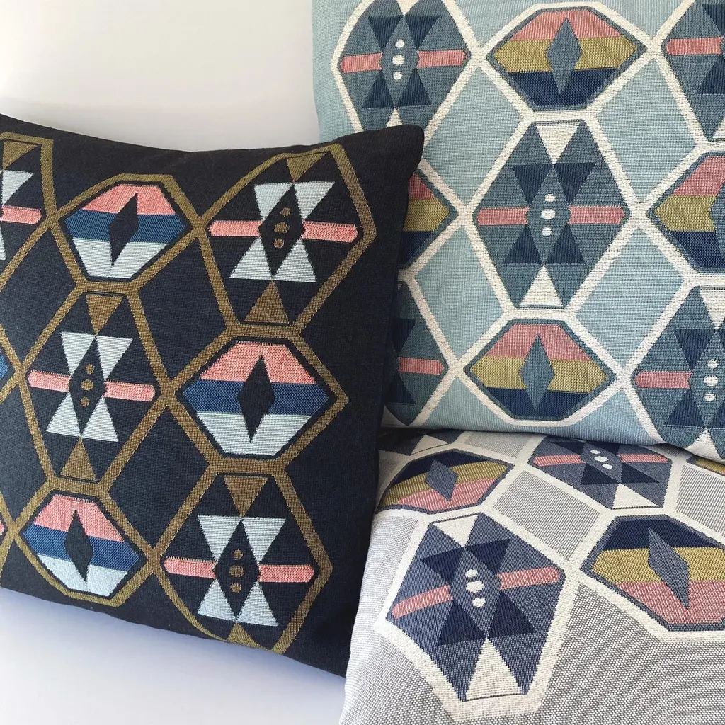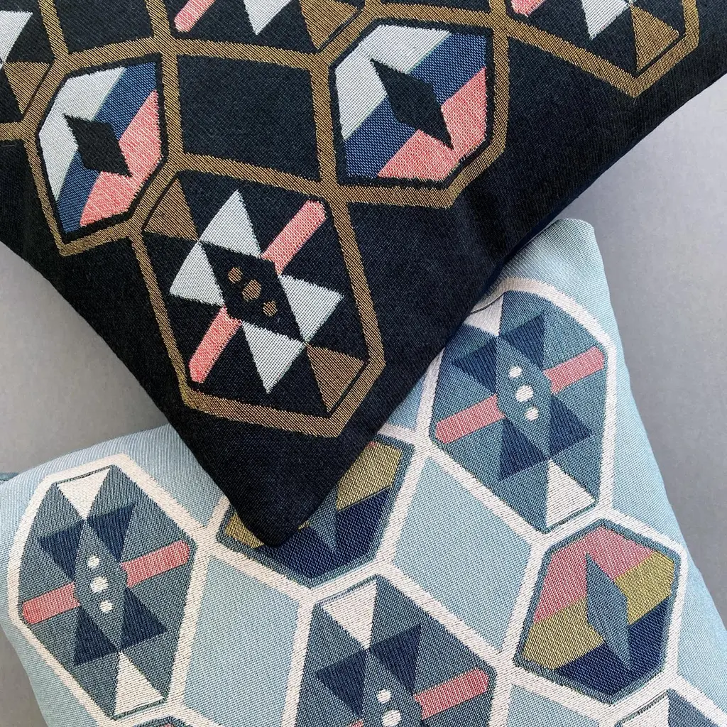 Twilight Navy geometric upholstered pillow with navy linen backing, down pillow insert made locally in NYC. Cotton upholstered fabric woven on a jacquard loom, made in the US. Pillow measures 17 x 17 inches.The geometric patterned pillow is inspired by a hand embroidered panel created by the designer. This pillow pairs beautifully with the indigo velvet pillows.Note: Invisible zip closure at bottom of pillow. Care Instructions: Spot treat only. Do not dry clean or machine wash.
