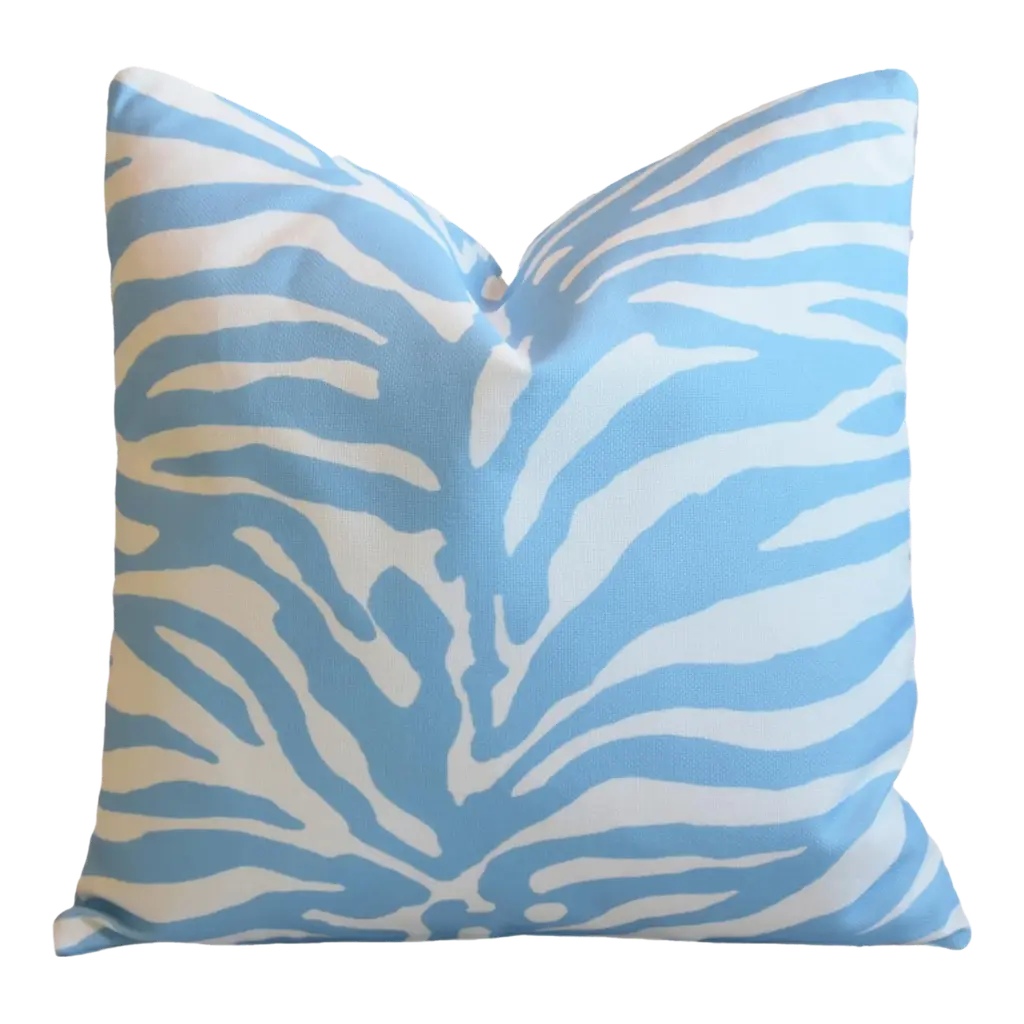 Exclusive to One Kings Lane: Rendered in light blue on white, this pillow's tiger print will bring both glamour and charm to your porch, patio, or poolside. Made in the USA of durable, weather-resistant materials, the pillow is printed on both sides so that you can get twice as much use out of it.One Kings Lane brings you a line of handcrafted furnishings and decor designed by us and available only here. In keeping with our distinctive aesthetic, the pieces range from classic to contemporary and are available in a gorgeous variety of handpicked fabrics, finishes, and hardware.