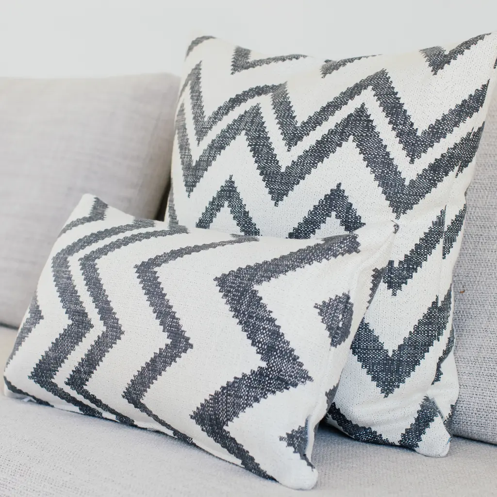 Made from a soft, 100% cotton upholstery grade fabric, the Lorenzo Zigzag 12x20 Gray pillows are perfect accents for a wide range of decor styles. The background color is a soft cream while the zigzags are a graphite gray. As a neutral accent piece, this pillow still provides enough color contrast and pattern to add strong visual interest. Size: 12"x20" Rectangular Fabric: 100% Cotton Same fabric front and back Knife edge seems Color matched, hidden zipper closure Dry clean only Made in Canada: Designed and made in Pillow Decor's Vancouver workroom.