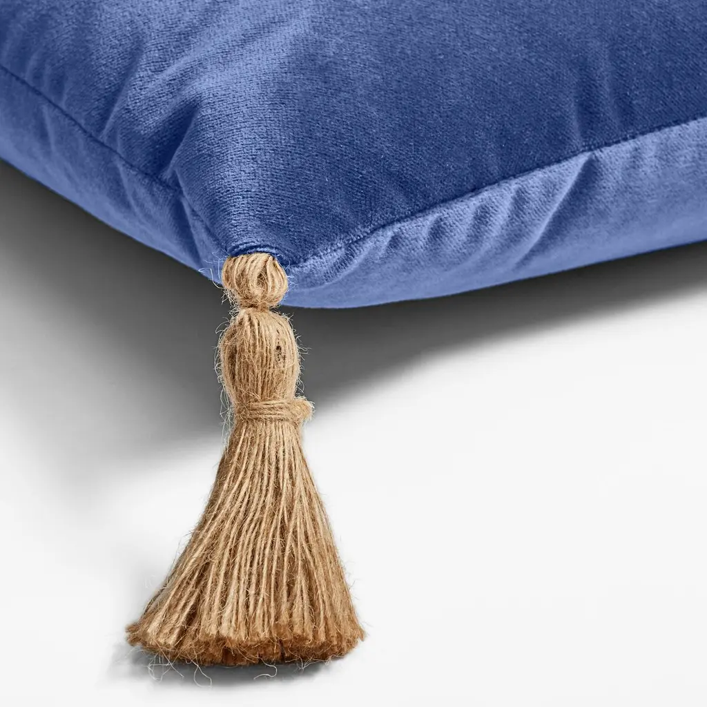 Designed by us and available only at One Kings Lane: Add a touch of texture to a favorite sofa or chair with this pillow, made of velvet with knife edges. Playful tassels adorn each corner. Insert included. Zipper closure.