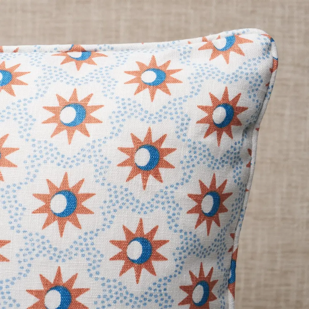 This pillow features Lucie with a self welt finish. The lively starbursts and crescent moons of Lucie fabric add celestial charm to any scheme. Pillow includes a feather/down fill insert and hidden zipper closure.