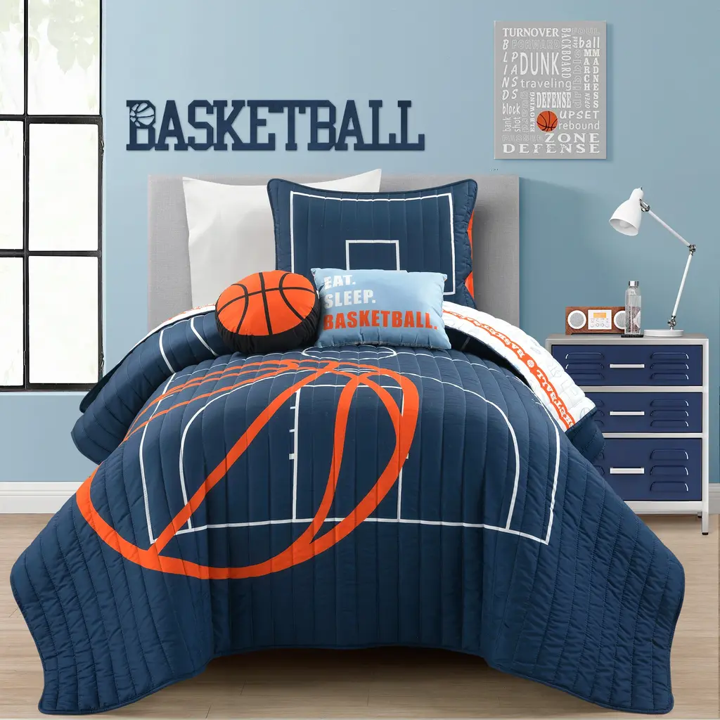 After your star youth basketball player gives it all they have on the basketball court, your child will need a cozy place to rest their head and recoup their energy for the next big game. Look no further than this bold basketball themed quilt set.This fun and exciting quilt set is designed with the youth basketball player (or super fan) in mind. The front features a much bolder basketball court graphic, while the reverse has a more subtle look of basketballs and backboards. The shams are also reversible. This unique quilt set includes a soft reversible quilt, matching pillow shams (1 sham for twin, 2 shams for full/queen), and two decorative accent pillows. The two throw pillows compliment the design and give the set a complete and styled look. Conveniently, the quilt and shams are machine washable. The decorative pillows should be spot cleaned. Please refer to the product labels for full care instructions.Features: