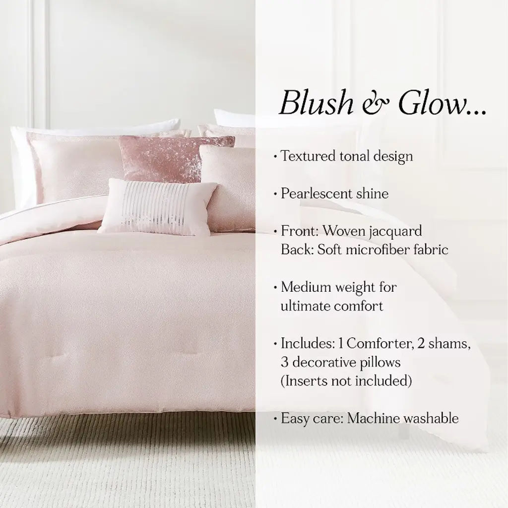 Add elegant texture and shine to your bed decor with the Lush Decor Raindrop Comforter Set. This dreamy bedding set is designed with a super soft, woven textured jacquard with an iridescent shine, creating a romantic, Hollywood glam look. This stunning 6-piece queen comforter set makes styling your bed a breeze! A perfect layering of textures, this bed set includes 3 throw pillows featuring sequins, velvet, and jacquard accents, easily becoming the focal point of your modern glam primary or guest bedroom. Crafted from a woven jacquard fabric front and microfiber back, this bedding set offers ultimate softness and comfort. The medium-weight polyfill is perfect for any type of sleeper, keeping you warm and cozy all year long. This 3 piece full/ queen size bedding set includes 1 comforter, 2 pillow shams, and 3 decorative throw pillows. Caring for this bed set is easy, simply machine wash cold on the gentle cycle and tumble dry on low. Iron on low heat to release wrinkles. Spot clean the throw pillows.