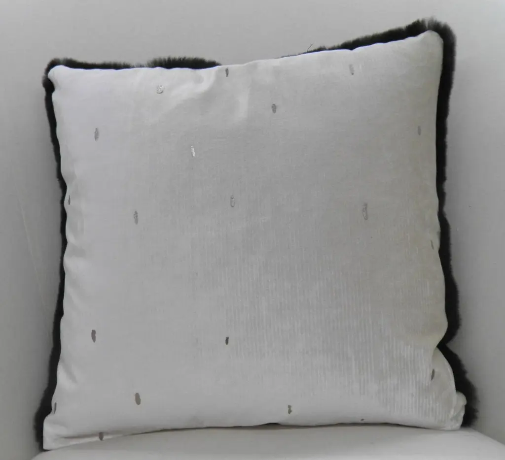 Genuine elegant Sheared Nutria fur throw pillows. These come in both 14" x 14" and 16" x 16", have been fully cleaned and are filled with 50/50 down/down feathers. Two backs are finished in a light taupe soft velvet. Two backs are finished in a cream soft velvet with bronze details. This posting is for the 16" x 16".