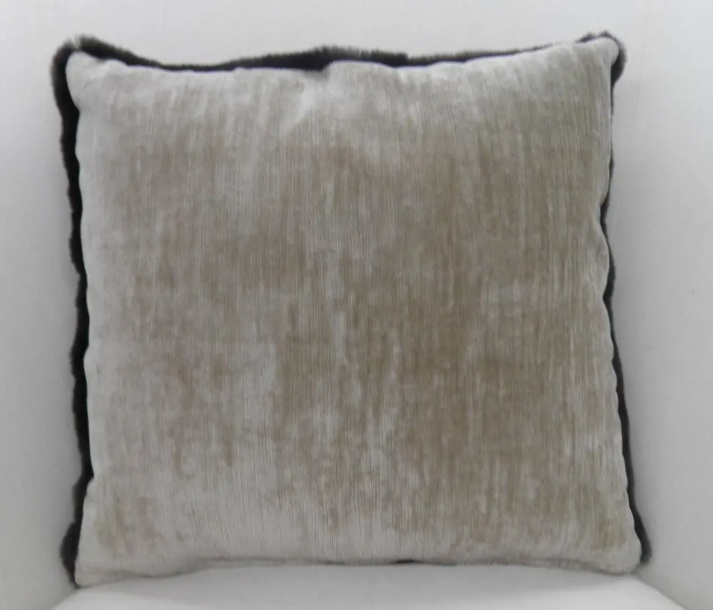 Genuine elegant Sheared Nutria fur throw pillows. These come in both 14" x 14" and 16" x 16", have been fully cleaned and are filled with 50/50 down/down feathers. Two backs are finished in a light taupe soft velvet. One back is finished in a cream soft velvet with bronze details. This posting is for the 14" x 14".
