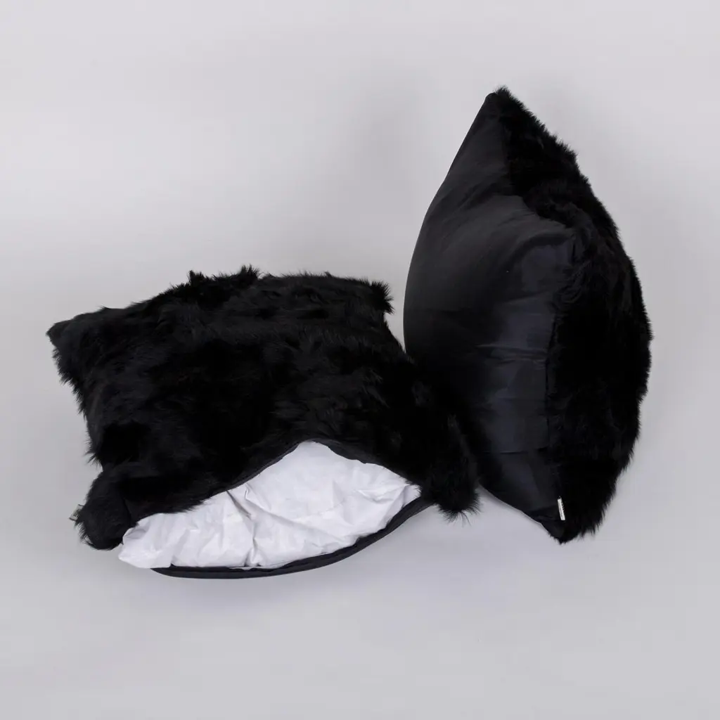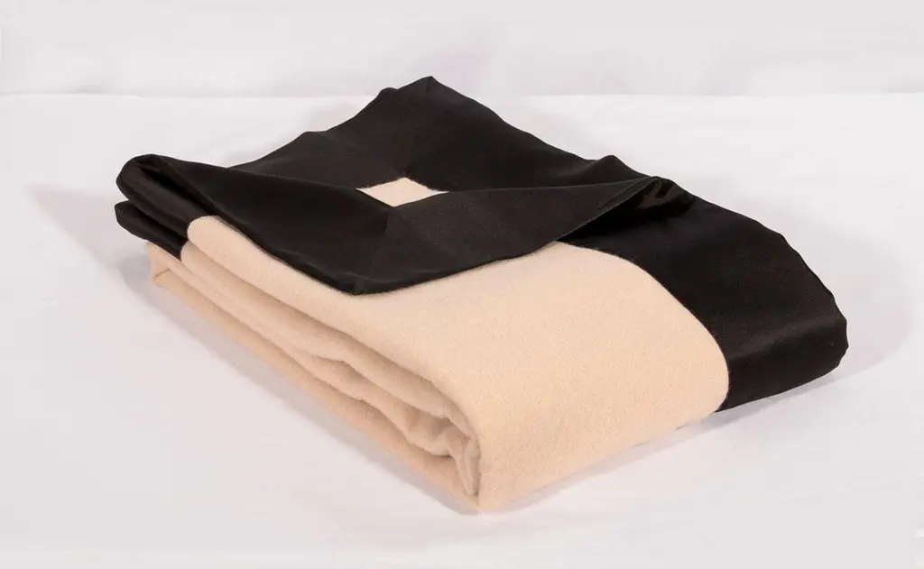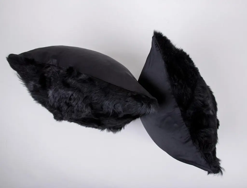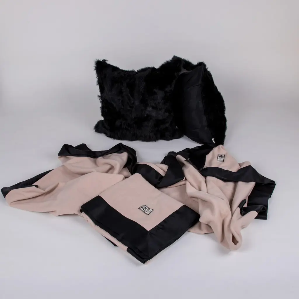 The Camille luxury queen size wool blanket is framed in black as night, 100% pure, 19mm JG Signature 4" silk borders. Luxurious and soft, she's a blend of the finest 15% Cashmere 85% Lambswool and milled in one of the oldest operating mills in England since 1783. Queen size - 90" x100”/ 230cm x 255cm . Bundled with our custom created real fur you can feel good about since it is "upcycled" from Italian glove factory "leave behinds." Black real sheepskin fur pillows backed in 100% silk Charmeuse are 24x24" and inserts are duck feather/duck down 90/10%. Set comes with two pillows.