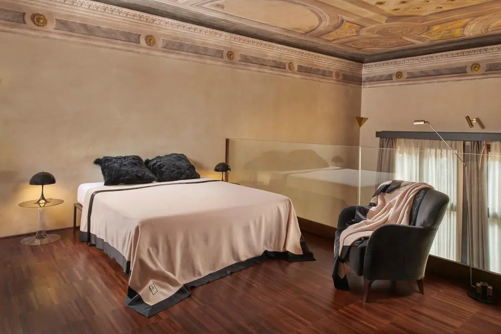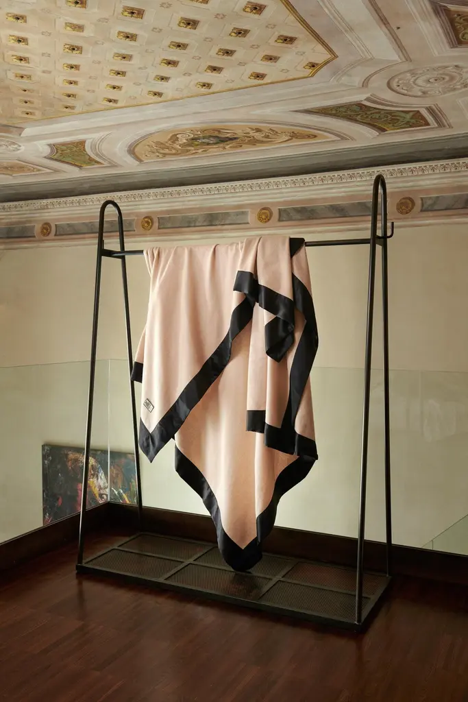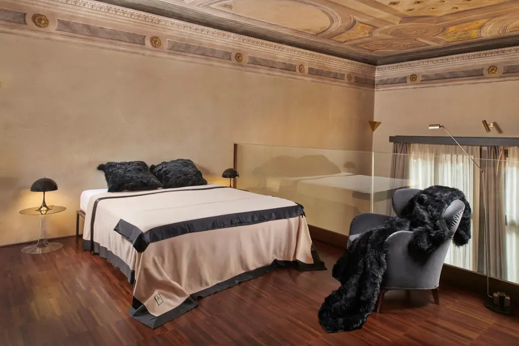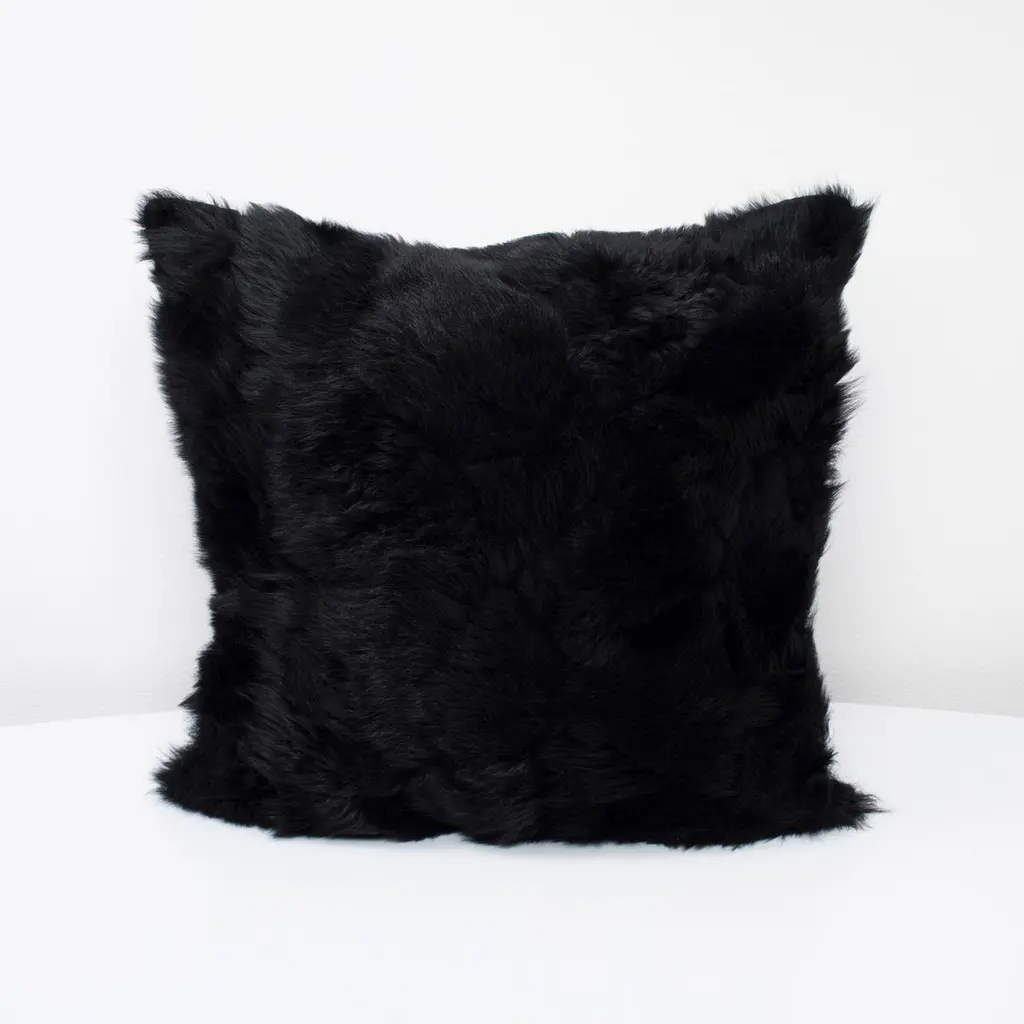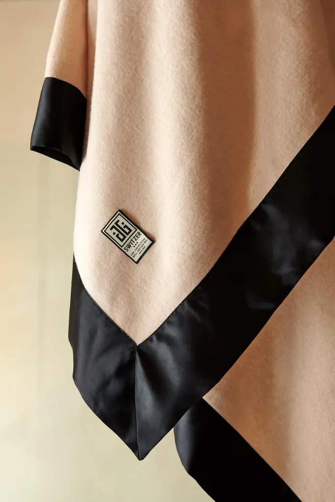 The Camille luxury queen size wool blanket is framed in black as night, 100% pure, 19mm JG Signature 4" silk borders. Luxurious and soft, she's a blend of the finest 15% Cashmere 85% Lambswool and milled in one of the oldest operating mills in England since 1783. Queen size - 90" x100”/ 230cm x 255cm . Bundled with our custom created real fur you can feel good about since it is "upcycled" from Italian glove factory "leave behinds." Black real sheepskin fur pillows backed in 100% silk Charmeuse are 24x24" and inserts are duck feather/duck down 90/10%. Set comes with two pillows.