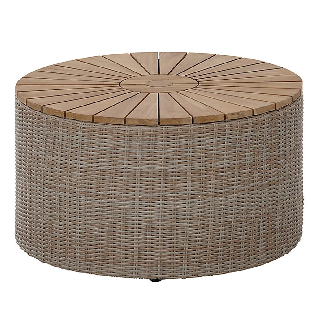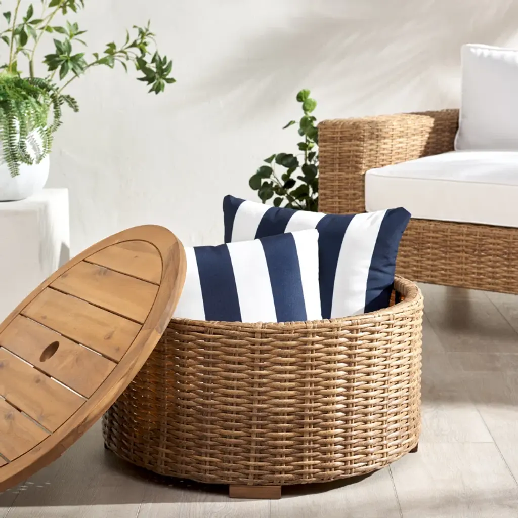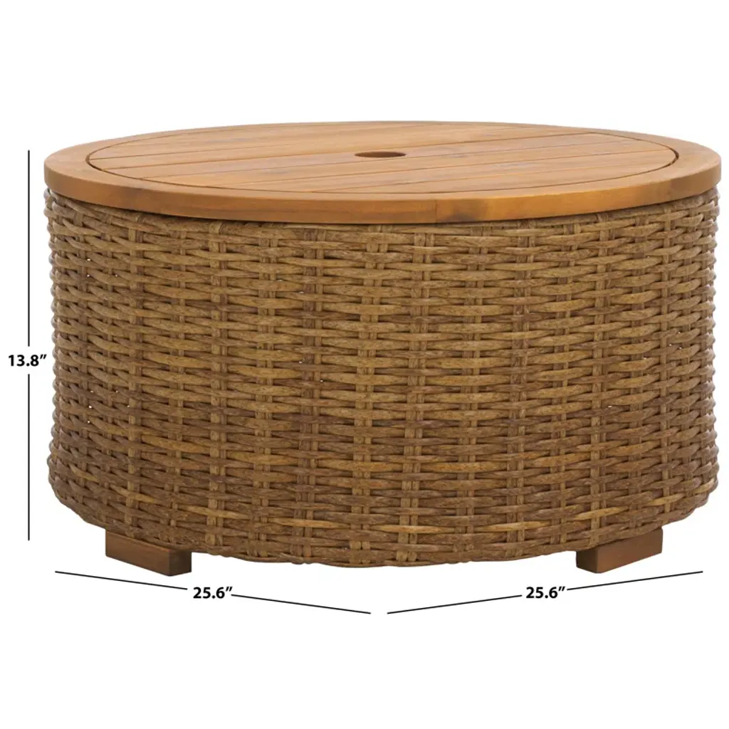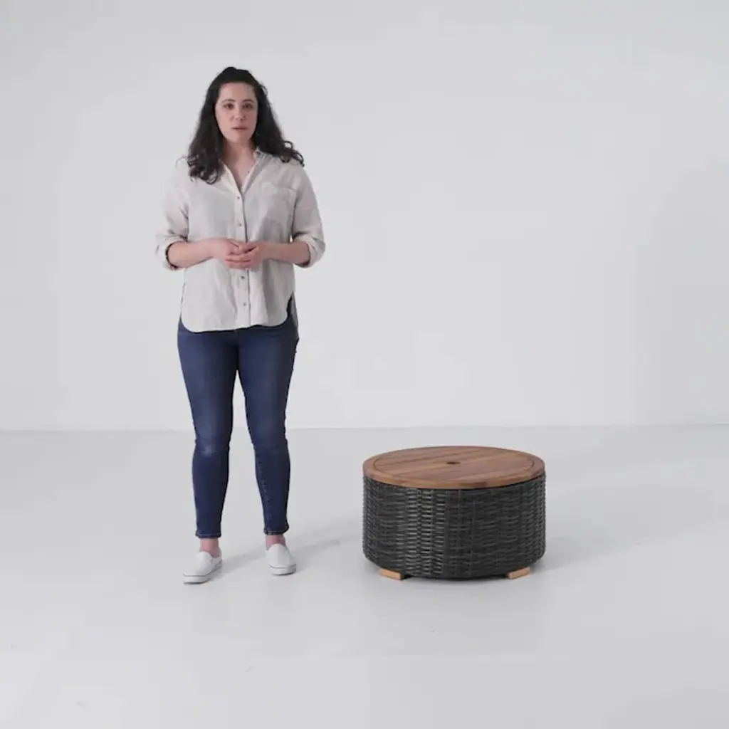 Give a chic and elegant update to your patio with our Maddie outdoor coffee table. Our coffee table brings textural warmth and practical appeal to any outdoor space. An all-weather wicker weave lends breezy sophistication to the table. Its perfectly rounded tabletop is crafted from acacia with a stunning slatted detail. The tabletop can be removed to provide storage for dumping your coasters, throw pillows, and other essentials. Perched upon powder-coated legs, our coffee table can serve as an elegant and practical centerpiece for your patio, terrace, or sunroom.
