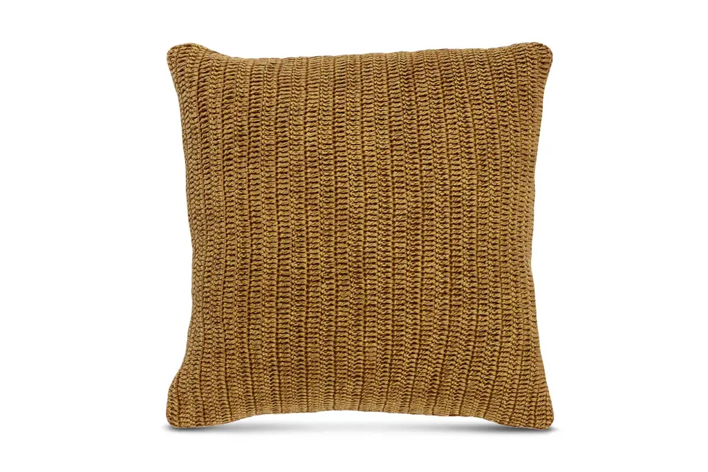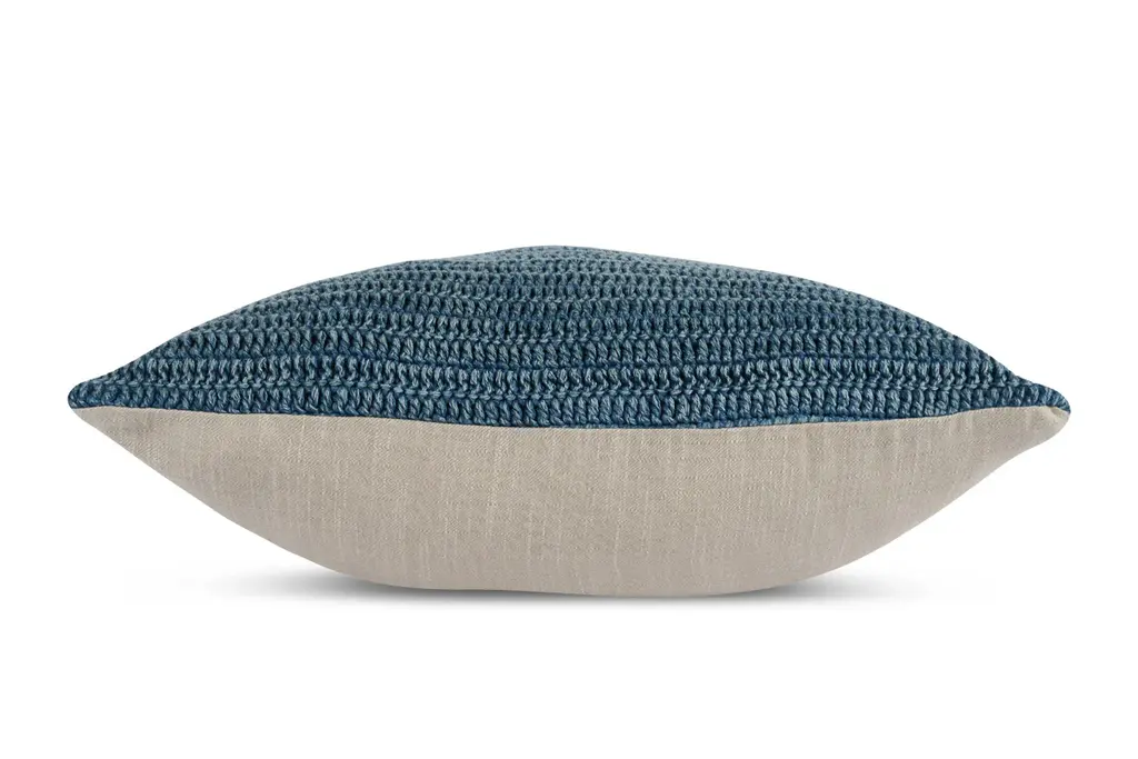 The Mallory Pillow is a casual hand-knitted 100% Belgian flax linen accent piece with multi-dimensional texture. It is dyed and stonewashed for softness and a natural distressed look. Inside you'll find a feather and down insert.