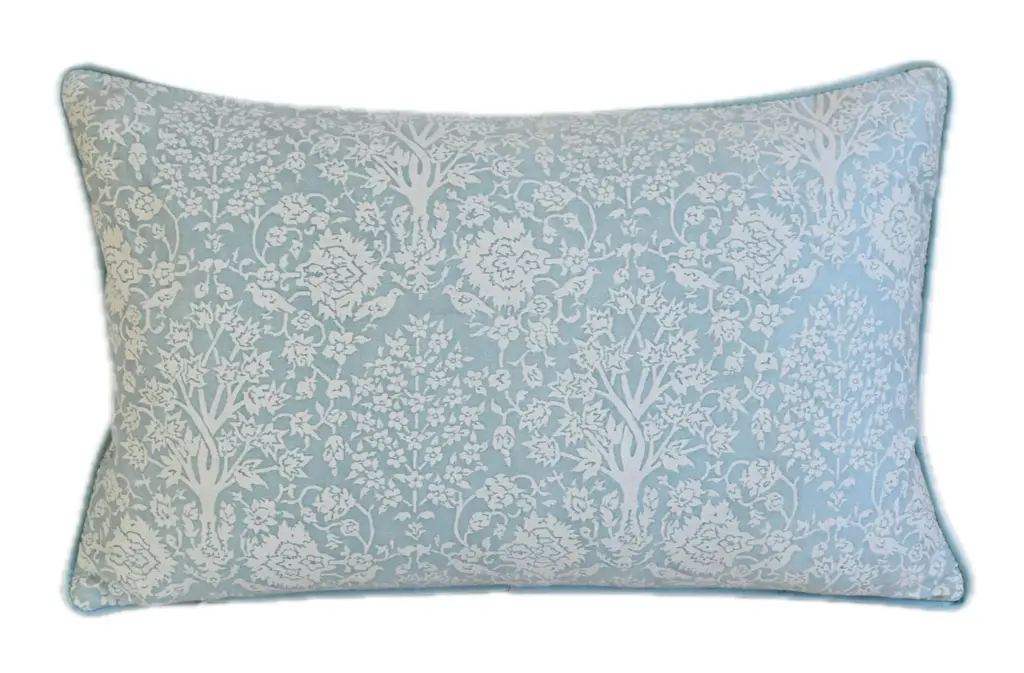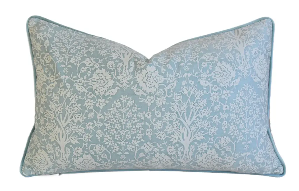 Custom-tailored Italian Venetian Mariano Fortuny pillow, made from a cotton fabric called "Alberelli" in a blue and white colorway from a design taken from its inspiration of 17th-century Perisian textiles. Complementary cotton velvet back. Custom cord trim. Hidden zipper closure. Plump, generous goose down/feather insert. Pattern placement may vary according to the fabric cut. Excellent new, unused, beautiful condition!!!!! ***PLEASE NOTE: I will combine shipping whenever possible if you purchase multiple items from my shop. Warm regards, Mike Seratt ***Also don't forget to take a peek at my other current listings...you just might find something you can't live without!!! It's easy just click on my name to the right of any listing highlighted in black "Mike Seratt of The Prized Pig" and presto it will bring you to my storefront!!! Cheers!!! Mike Seratt I SHIP OUT IMMEDIATELY, SO THE ESTIMATION YOU SEE FOR THE DELIVERY TIMELINE IS CHAIRISH'S OVERALL GENERAL TIMELINE, BUT I WILL GET THIS OUT THE NEXT DAY AND DELIVERY IS USUALLY 5-7 DAYS AT MOST
