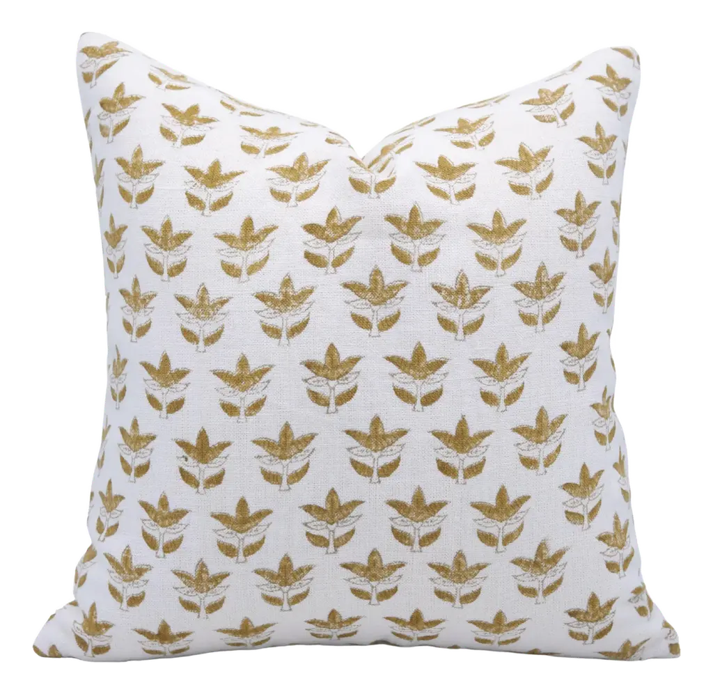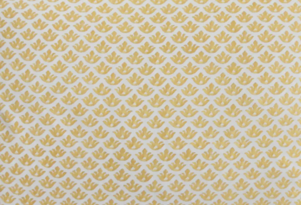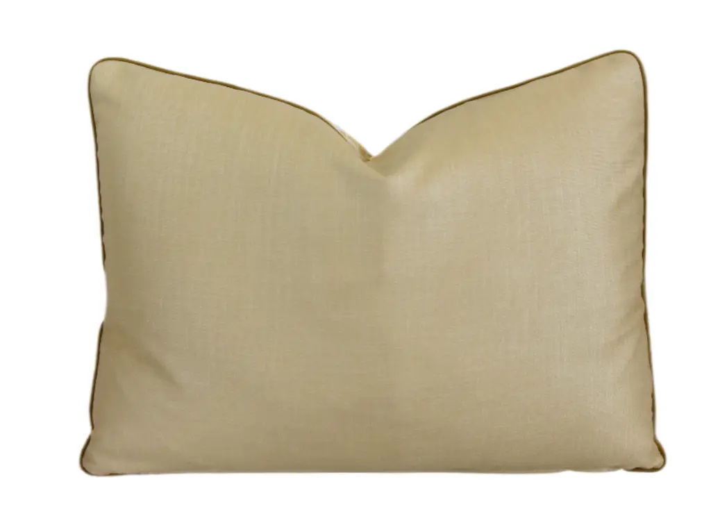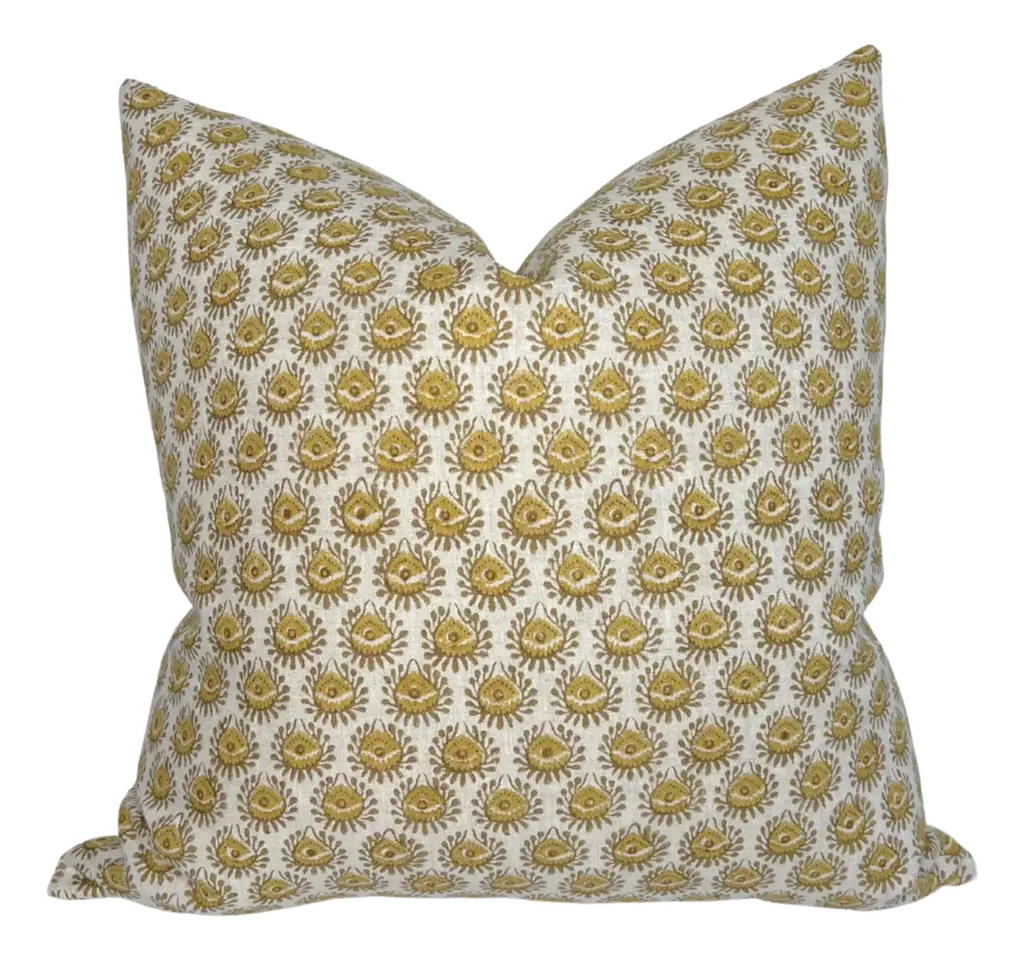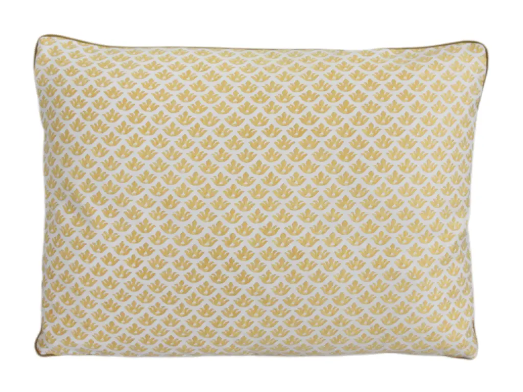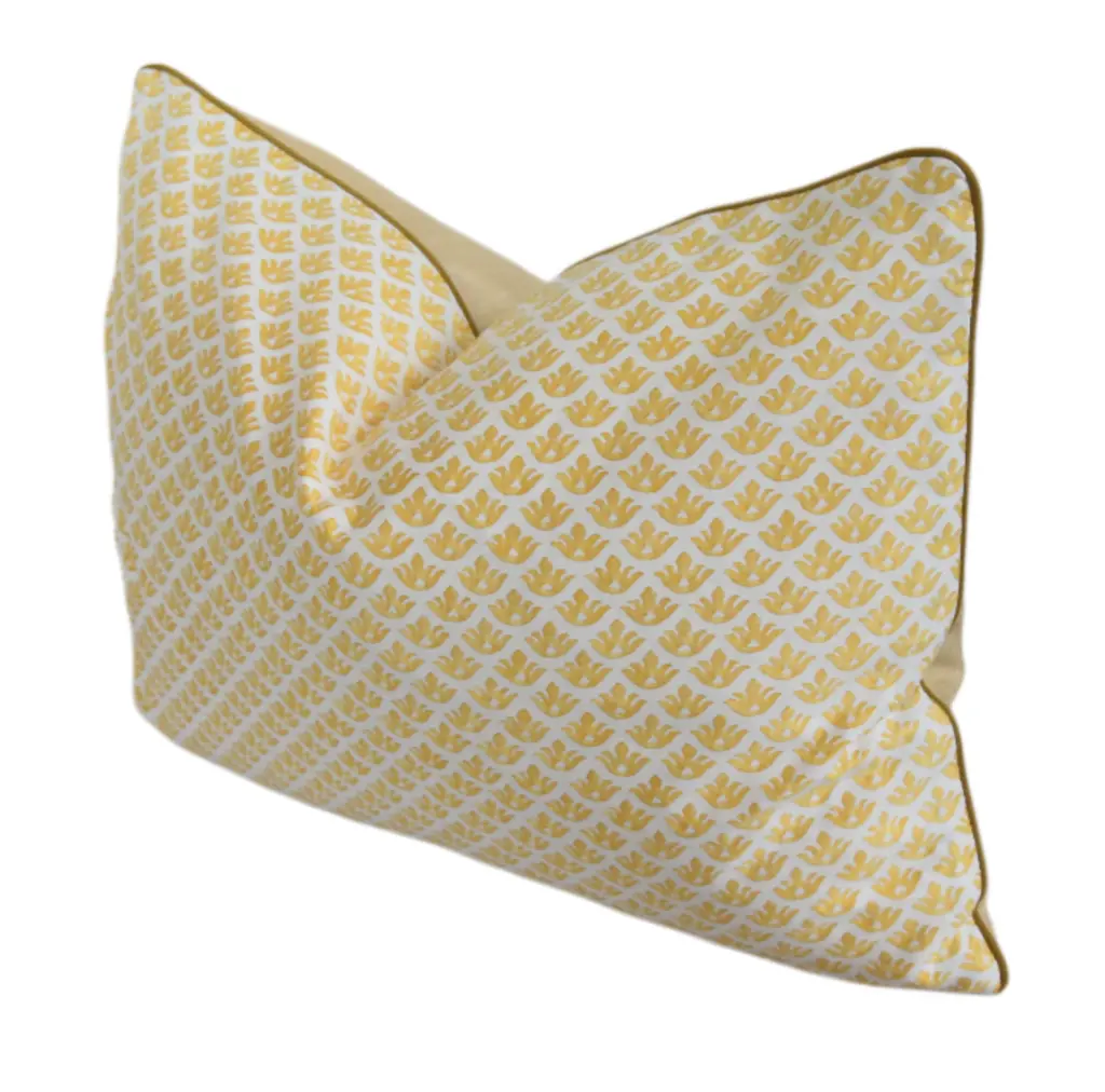 Custom-tailored pillow in Italian designer Mariano Fortuny's premium cotton fabric called "Canestrelli” in a yellow and white colorway. Complementary linen fabric back. Custom cord piping trim. Hidden zipper closure. Generous plump goose feather-and-down insert. Excellent, new, unused, beautiful condition!!!