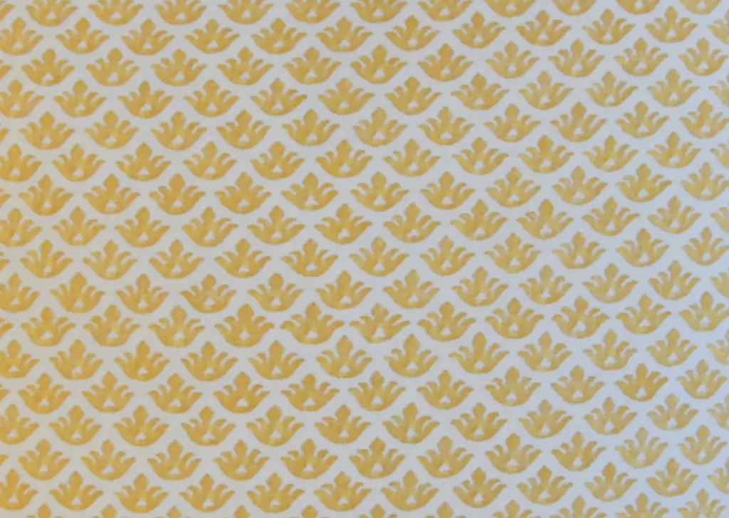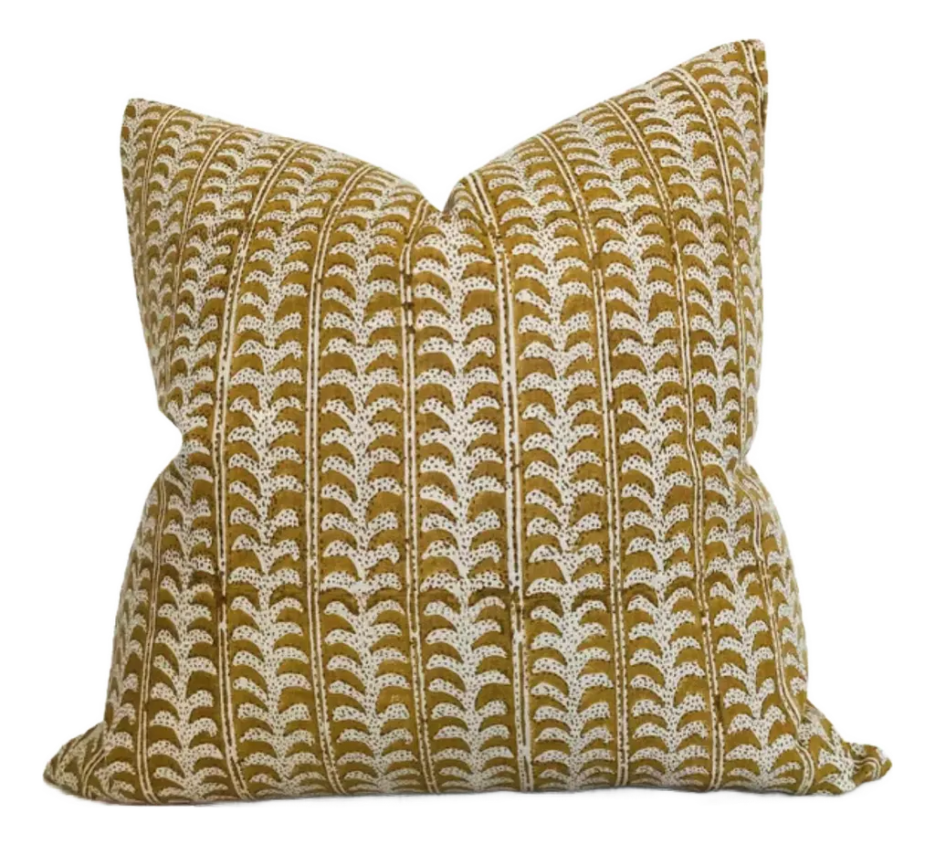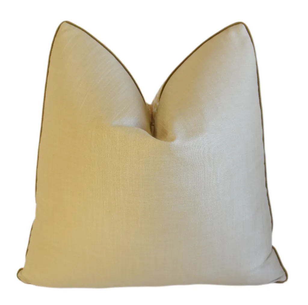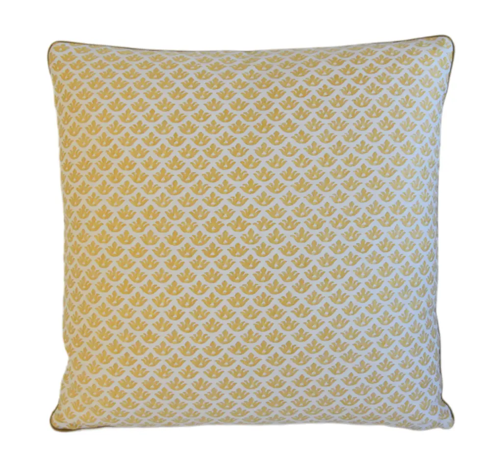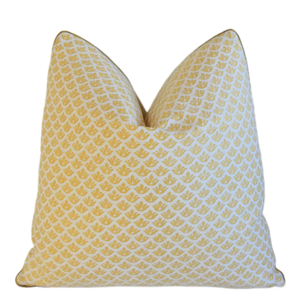 Custom-tailored pillow by Mike Seratt of The Prized Pig in Italian designer Mariano Fortuny's premium cotton fabric called "Canestrelli���� in a yellow and white colorway. Gold-colored linen fabric back. Custom cord piping trim. Zipper closure. Generous plump goose feather-and-down insert. Excellent, new, unused, and in beautiful condition!!!