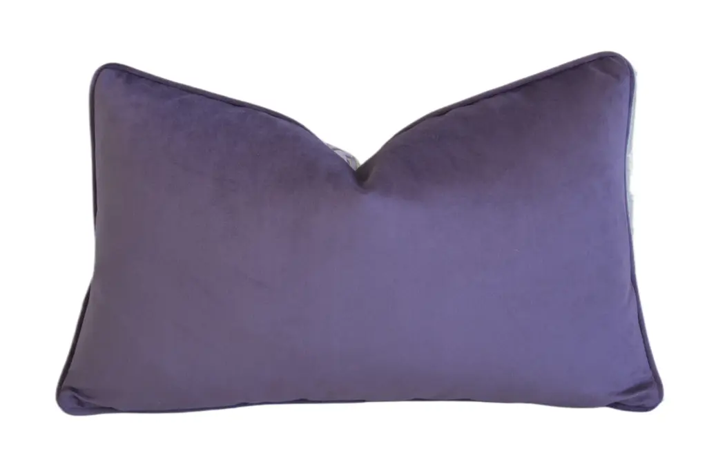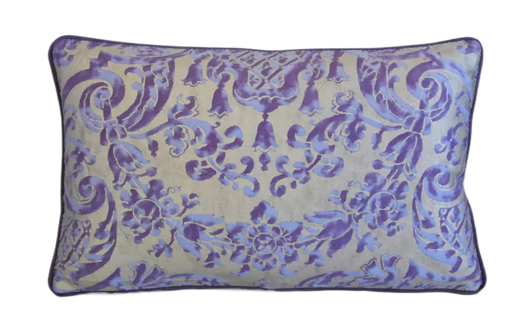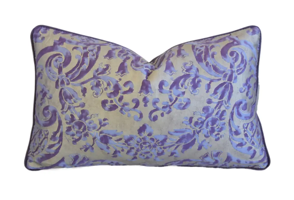 Custom-tailored pillow in Italian designer Mariano Fortuny's premium Egyptian cotton fabric called "Carnavalet" in a beautiful royal-purple and silvery-gold colorway. The design was inspired by a 17th-century French design. The pillow reverse is a complementary purple cotton-velvet fabric. Custom cord piping trim. Hidden zipper closure. Plump, generous goose feather-and-down insert. All pillows in this listing have an identical front pattern design layout. Excellent new, unused condition!!