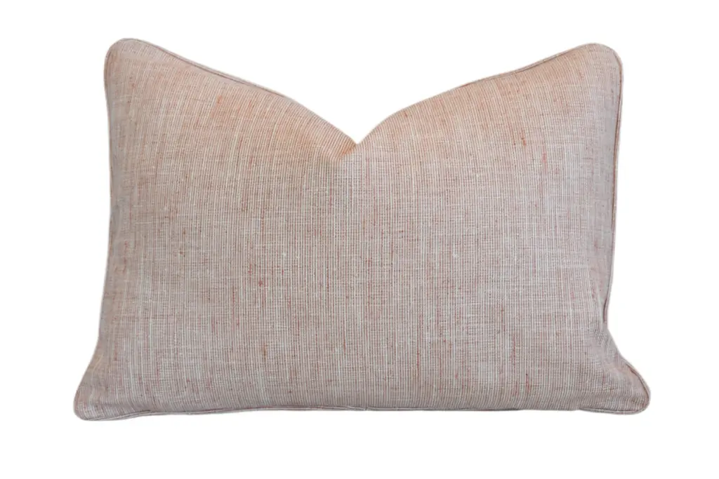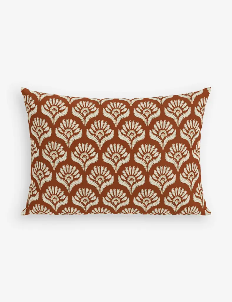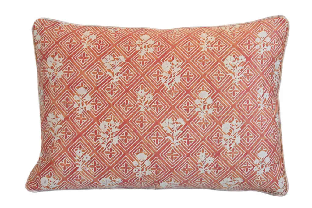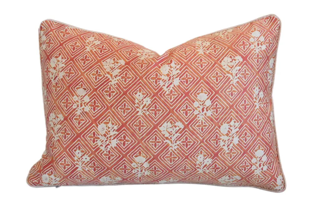 Custom-tailored pillow in designer Italian Mariano Fortuny cotton fabric called "Jupon Bouquet" with a bittersweet red and antique white cream colorway. Jupon Bouquet is a simple, sweet design with clean, geometric line work punctuated by a heraldic flowering floral flourish bouquet. Woven complementary fabric back with matching custom cord piping trim. Invisible zipper closure. Plump generous plump goose down/feather insert. Excellent new unused condition!!!