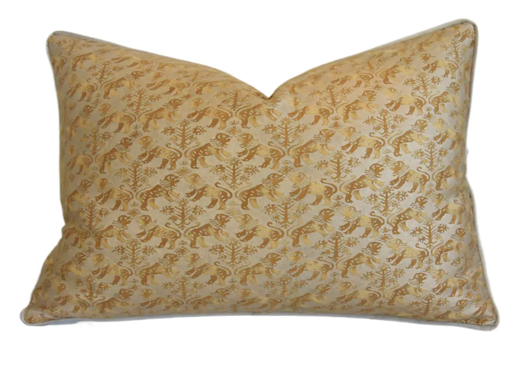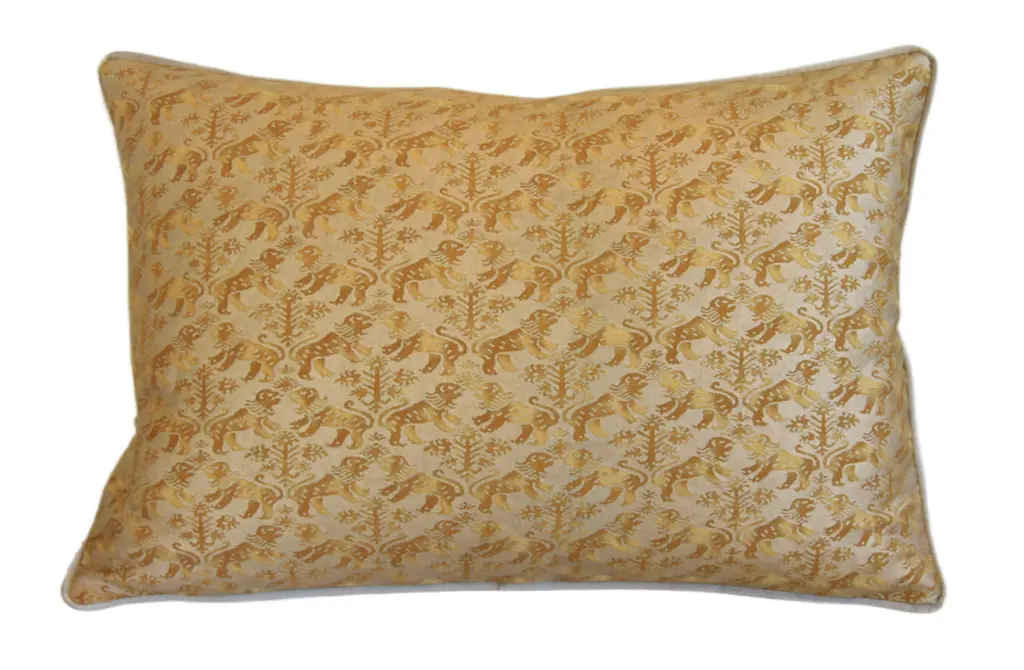 Custom-tailored Italian Mariano Fortuny pillow in an Egyptian premium cotton fabric from Fortuny called "Richelieu" depicting regal lions. The design was inspired by the 17th-century French Cardinal of the court of Louis XIII. The pillow reverse is a complementary fabric. Custom cord piping trim. Hidden zipper closure. Plump, generous goose feather-and-down insert. Excellent new, unused condition!!