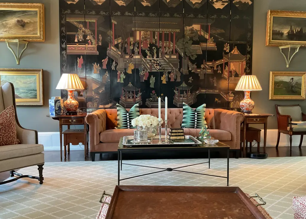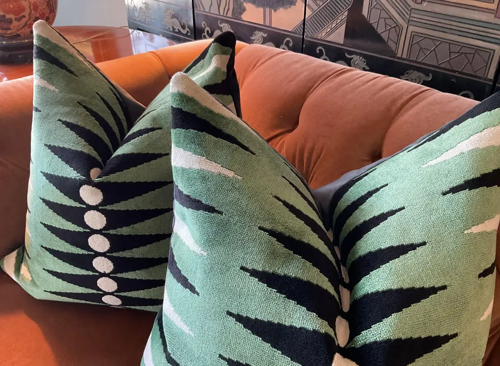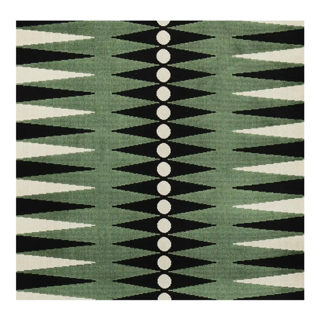 A luxe gameboard pattern, Schumacher's " Backgammon" features a rich green palette with contrasting point for play.It combines a classic backgammon layout with the brand’s upscale textile design, giving it a sophisticated and decorative look suitable for both gaming and display. So fun! Pattern placement will vary. These will come as a 22" pair with plush- down inserts.
