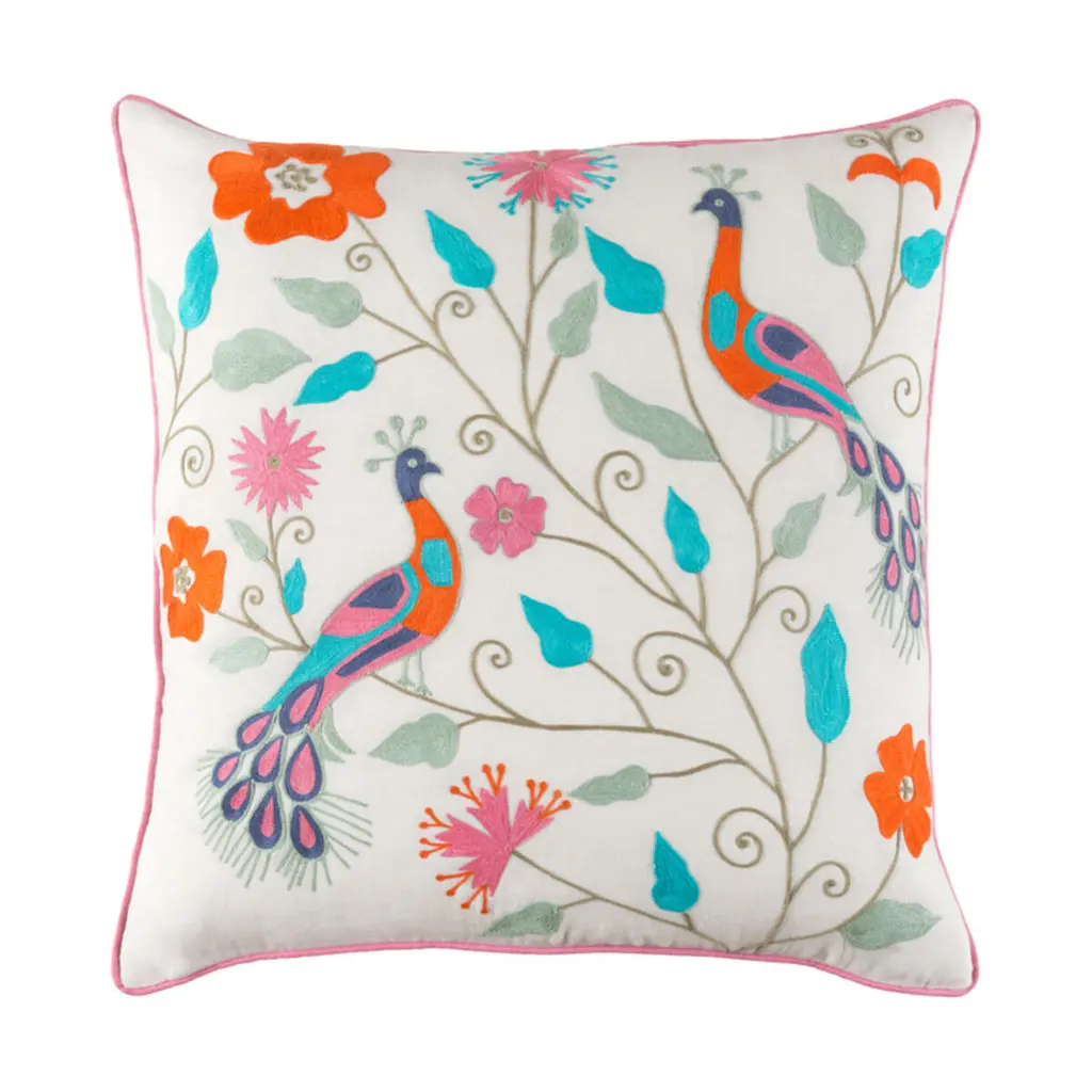 Beautifully crafted, the Mayura collection by Surya is an art piece of its on calibur that you can snuggle with. This pillow's face is intricately woven in India and features to colorful peacocks among a floral design. This pillow also features a piped edge that seems to frame the artwork showcased on this lovely addition. Please spot clean and line dry this pillow only to ensure a long life.