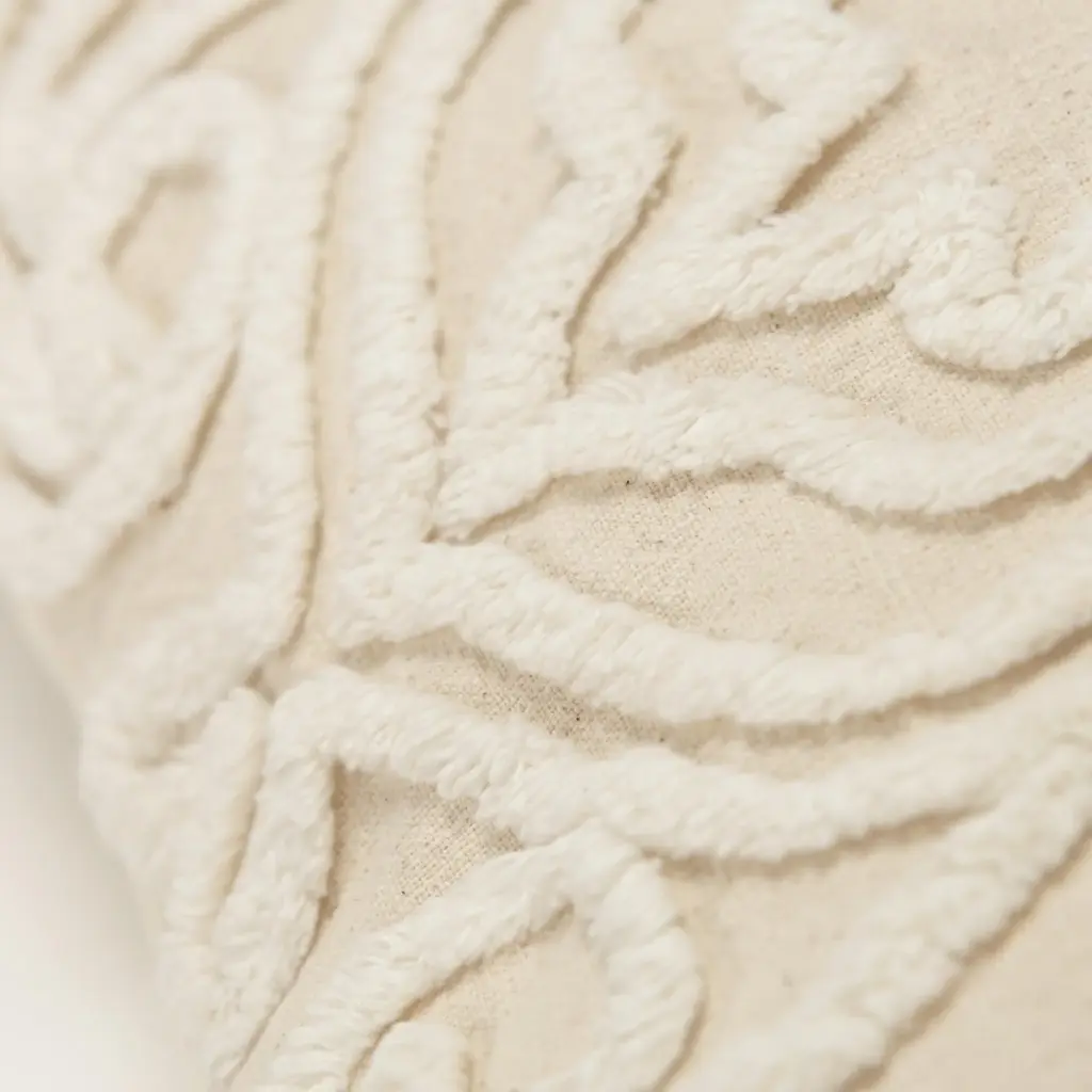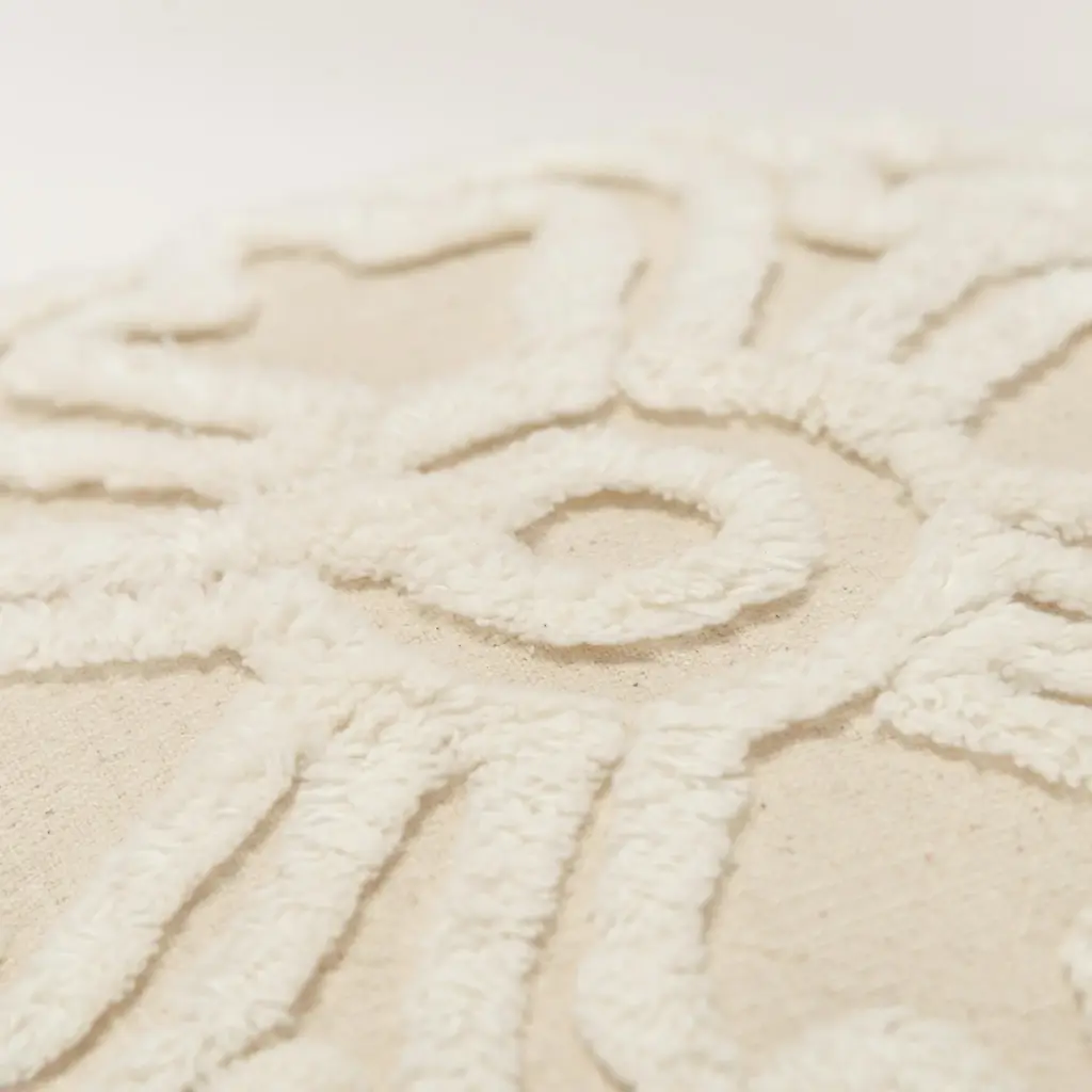This accent pillow is the ultimate statement piece for your living space. Measuring 20" x 20", this pillow is made from 100% premium cotton, woven into transitional medallion designs with a solid modern industrial finish. Boasting a botanical-inspired design with tufted patterning for added visual interest, the heavy texture adds to the pillow's unique charm and subtle sophistication. The coordinating solid back is cleverly finished with a hidden zipper closure for ease of fill. The shades of natural and crisp ivory create sensory elegance that effortlessly elevates your décor. Fall in love with this beautifully crafted decorative accent pillow that's both visually stunning and equally comfortable.
