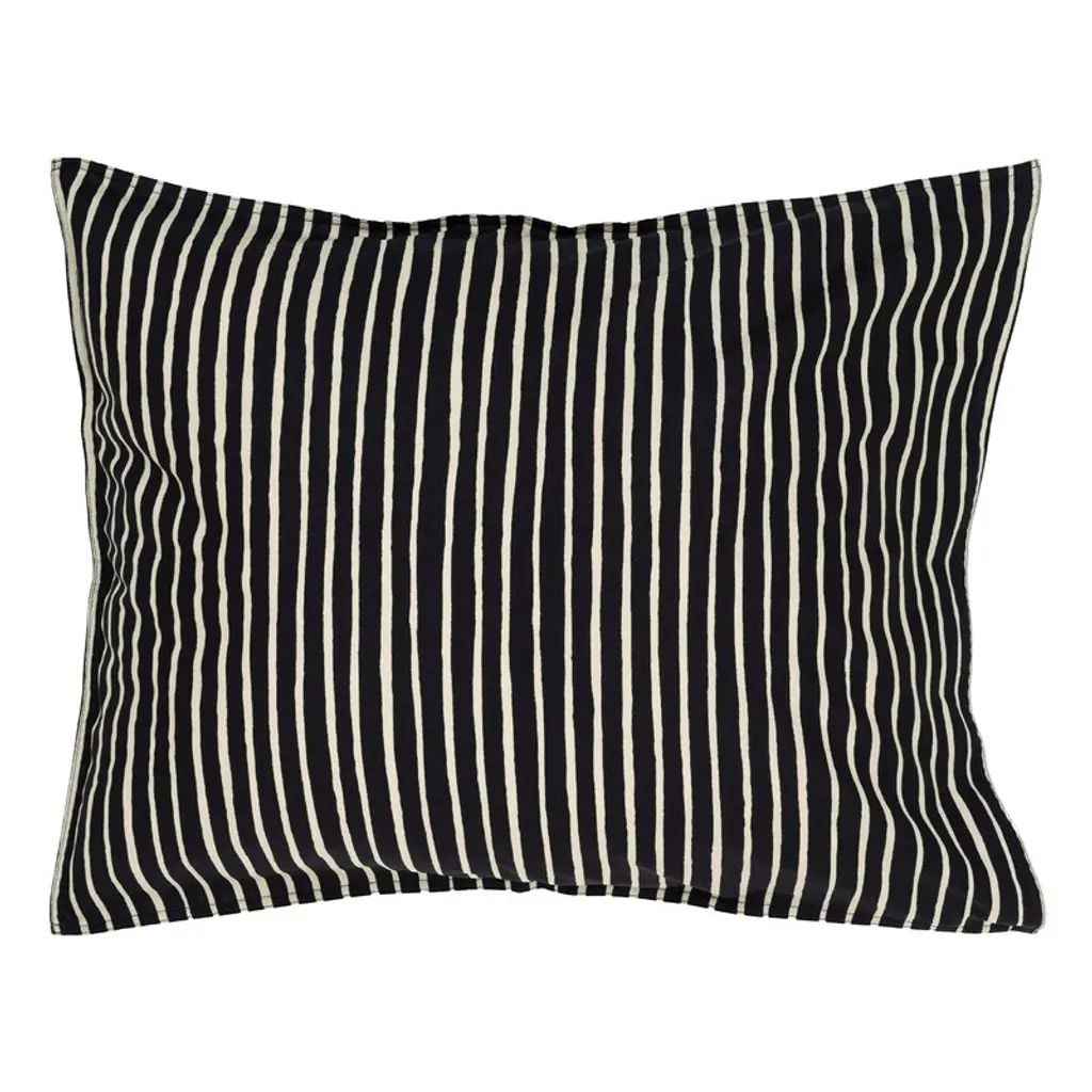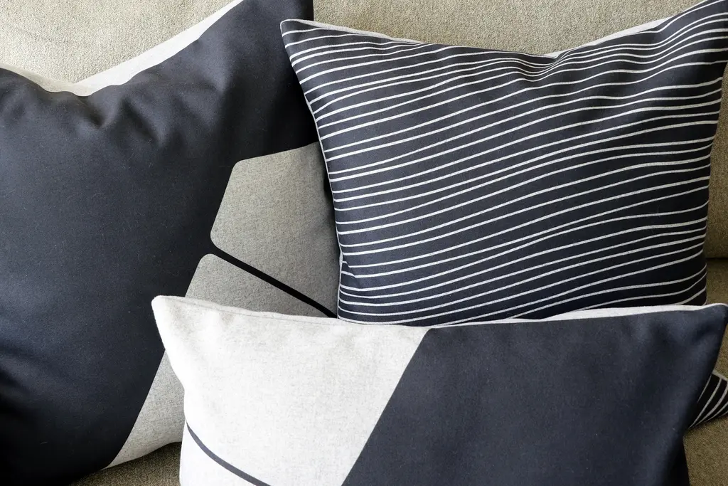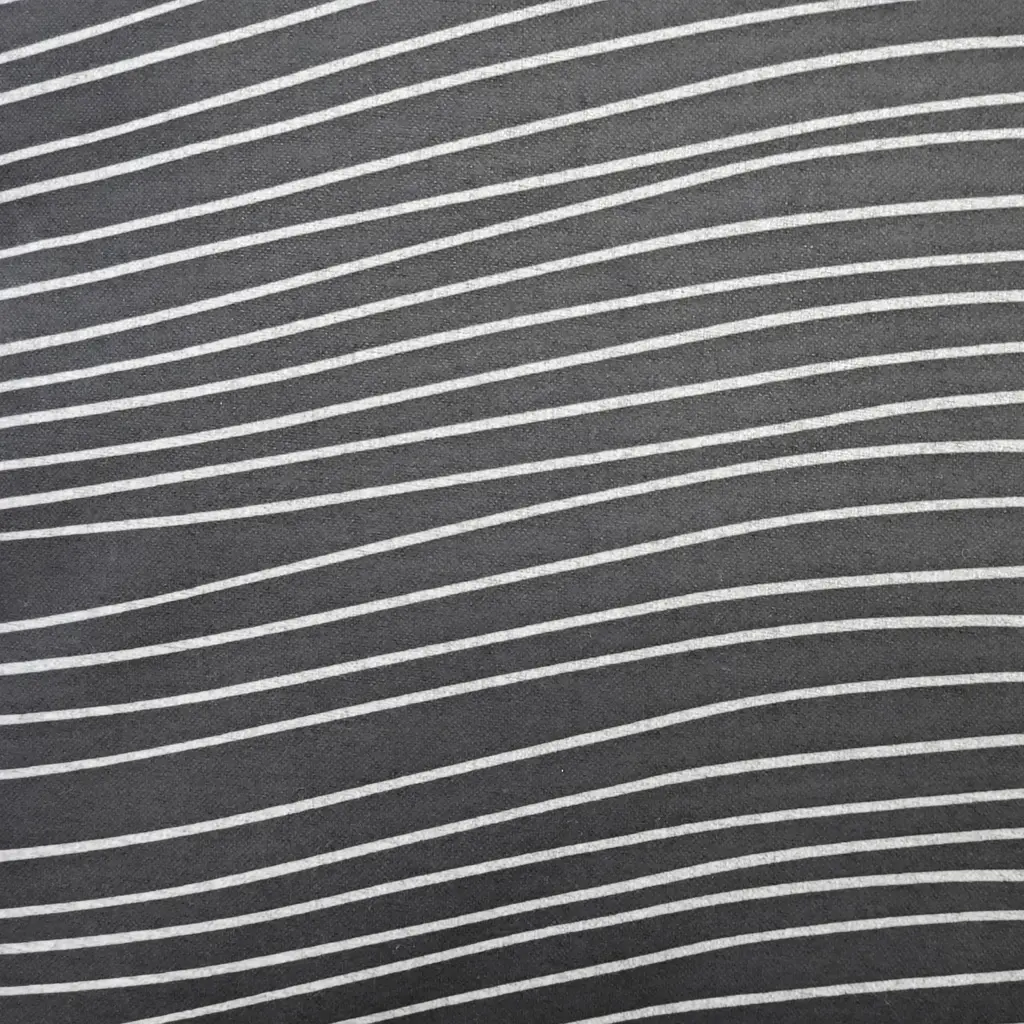 The 19 inch square Meraki Charcoal Black Throw Pillow features a fine wave pattern in light gray and deep charcoal black. This simple and tranquil pattern lends itself well to a wide range of home décor styles from contemporary to modern-retro. The back of the pillow is plain unprinted light gray felt fabric. From the Petra Kaksonen designer collection. Size: 19"x19" Square Fabric: 100% Polyester Design on front only. The back is light gray felt fabric. Knife edge seams. Inside seams are serged for strength and durability. Hidden zipper closure in bottom seam of pillow cover Dry cleaning is recommended, or machine wash separately in cold water on delicate cycle. Lay flat to dry, iron inside out on low heat. Benjamin Moore best color match (Nightfall-1596 - Classic Colors Collection) Made in Canada in Pillow Decor's Vancouver workroom.