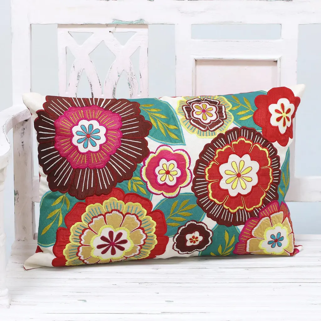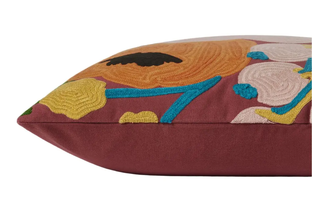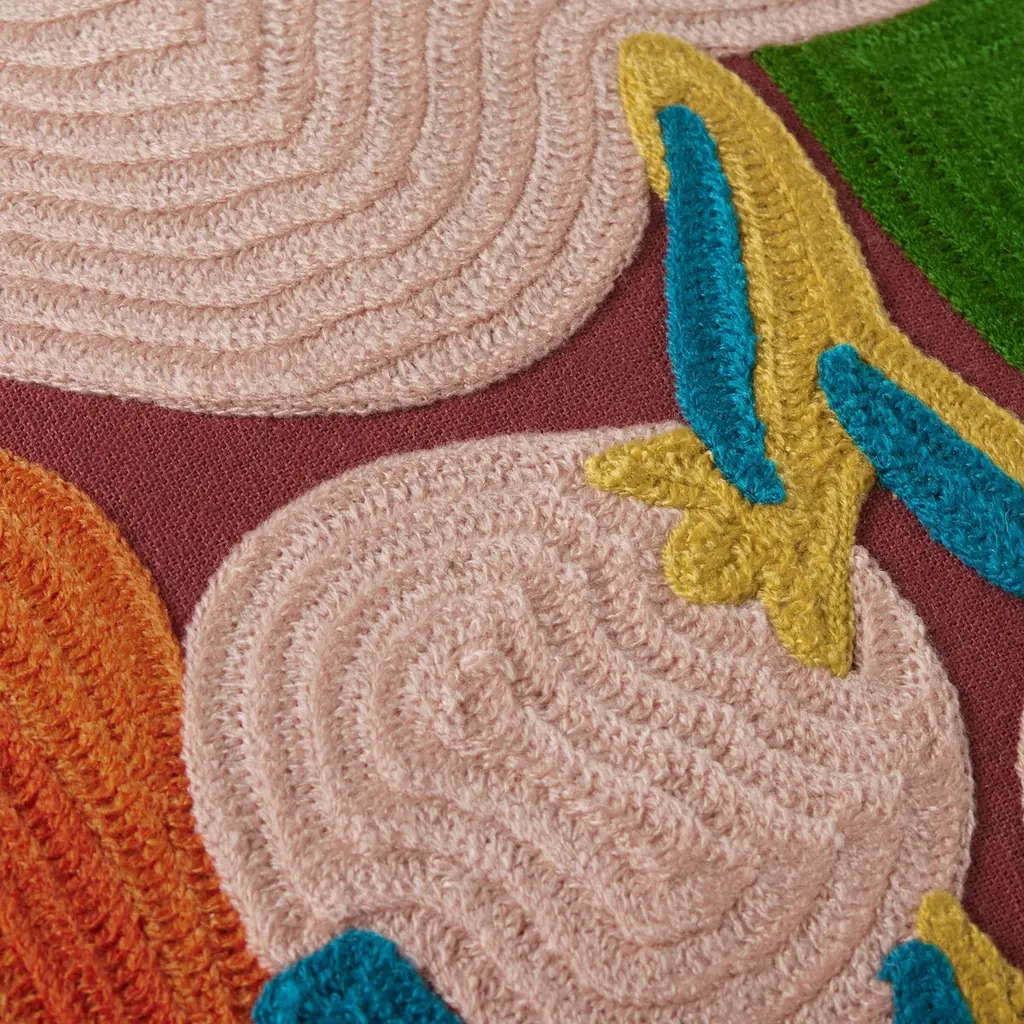 The Merce Pillow features a bold background beautifully decorated with an array of colorful patterns. This lively design adds a vibrant touch to any space while providing a soft and comfortable accent.
