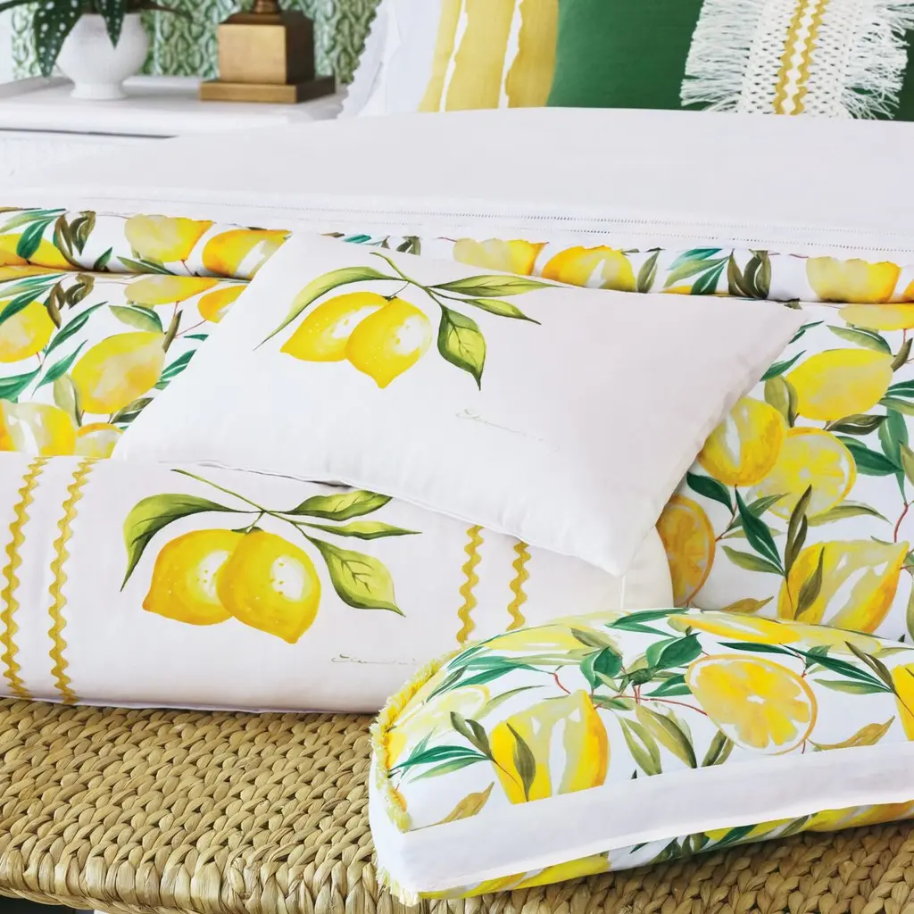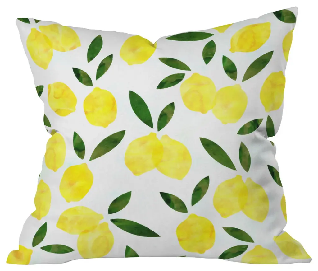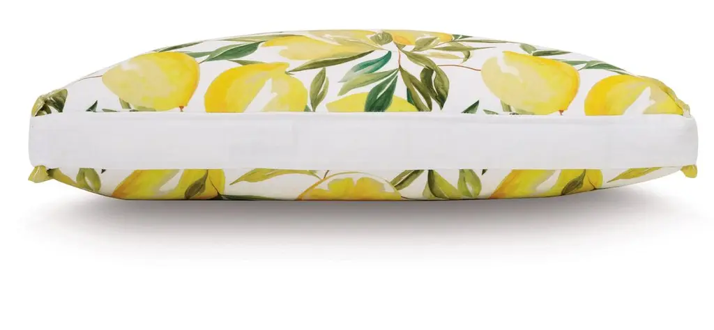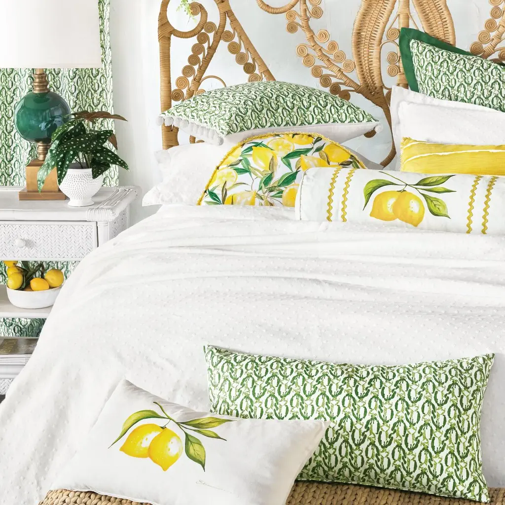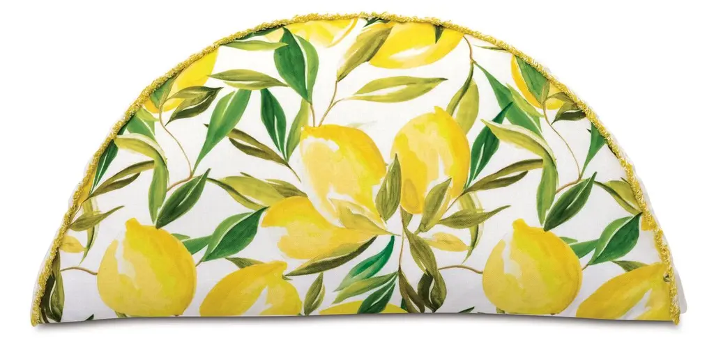 Shaped like a lemon wedge, this pillow is an ideal combination of elegance and whimsy. The elegance comes courtesy of the painterly lemon motif on both sides of the pillow; eyelash-fringe trim—and of course the playful shape—contribute the whimsy. The plume-feather fill ensures luxe loftiness. Zipper closure.