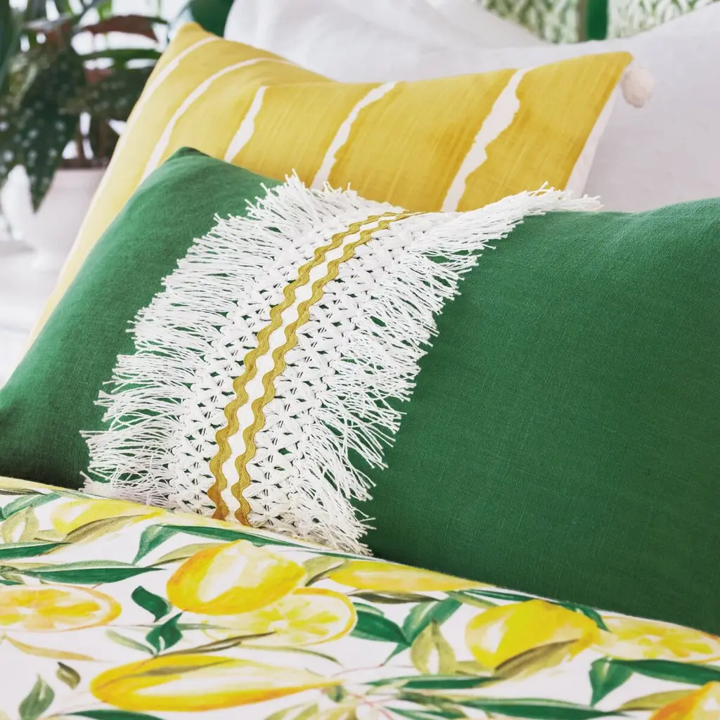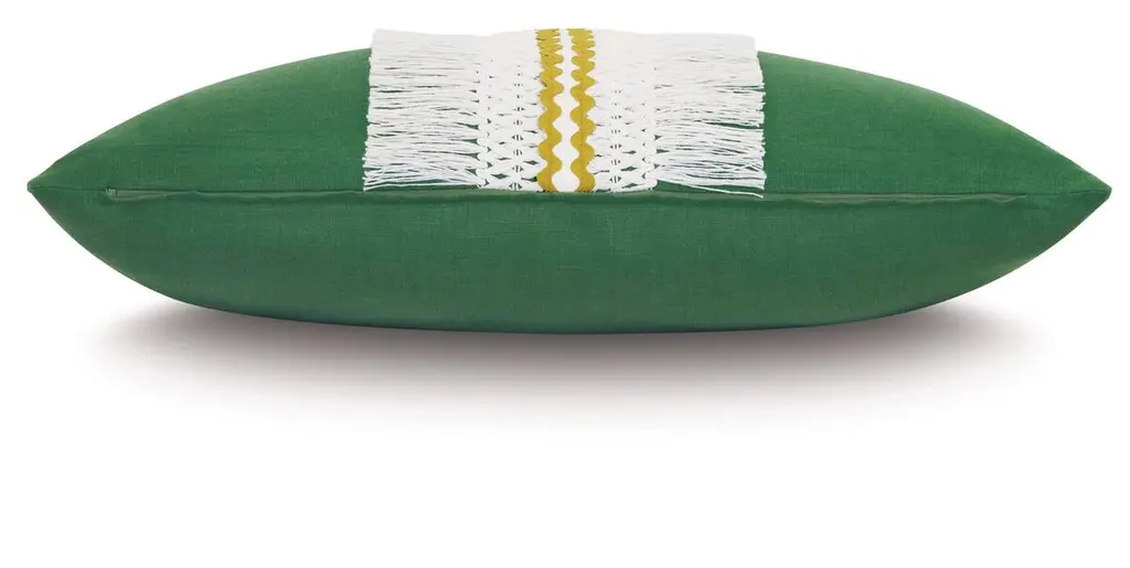 Boho fringe with a yellow rickrack stripe gives the front of this linen pillow artisanal charm. The plume-feather fill ensures long-lasting loftiness. Solid back. Zipper closure.