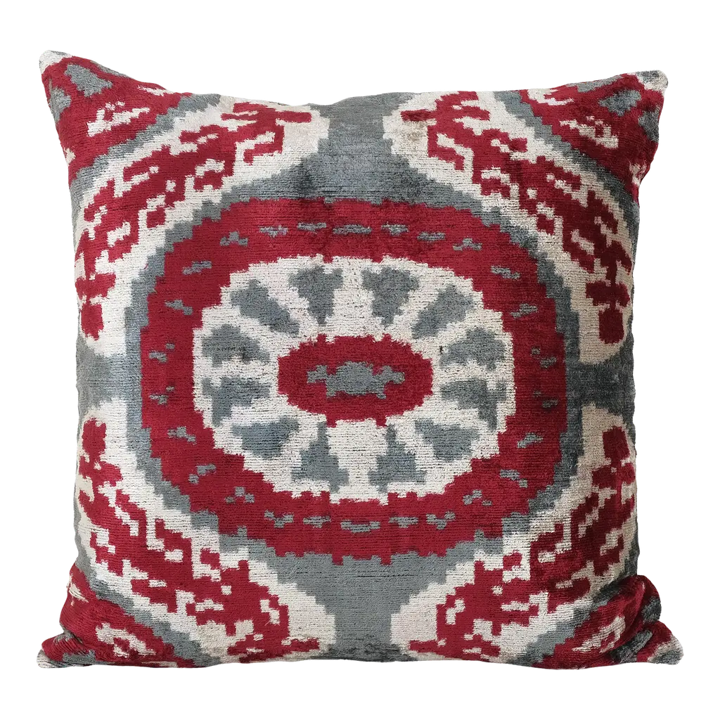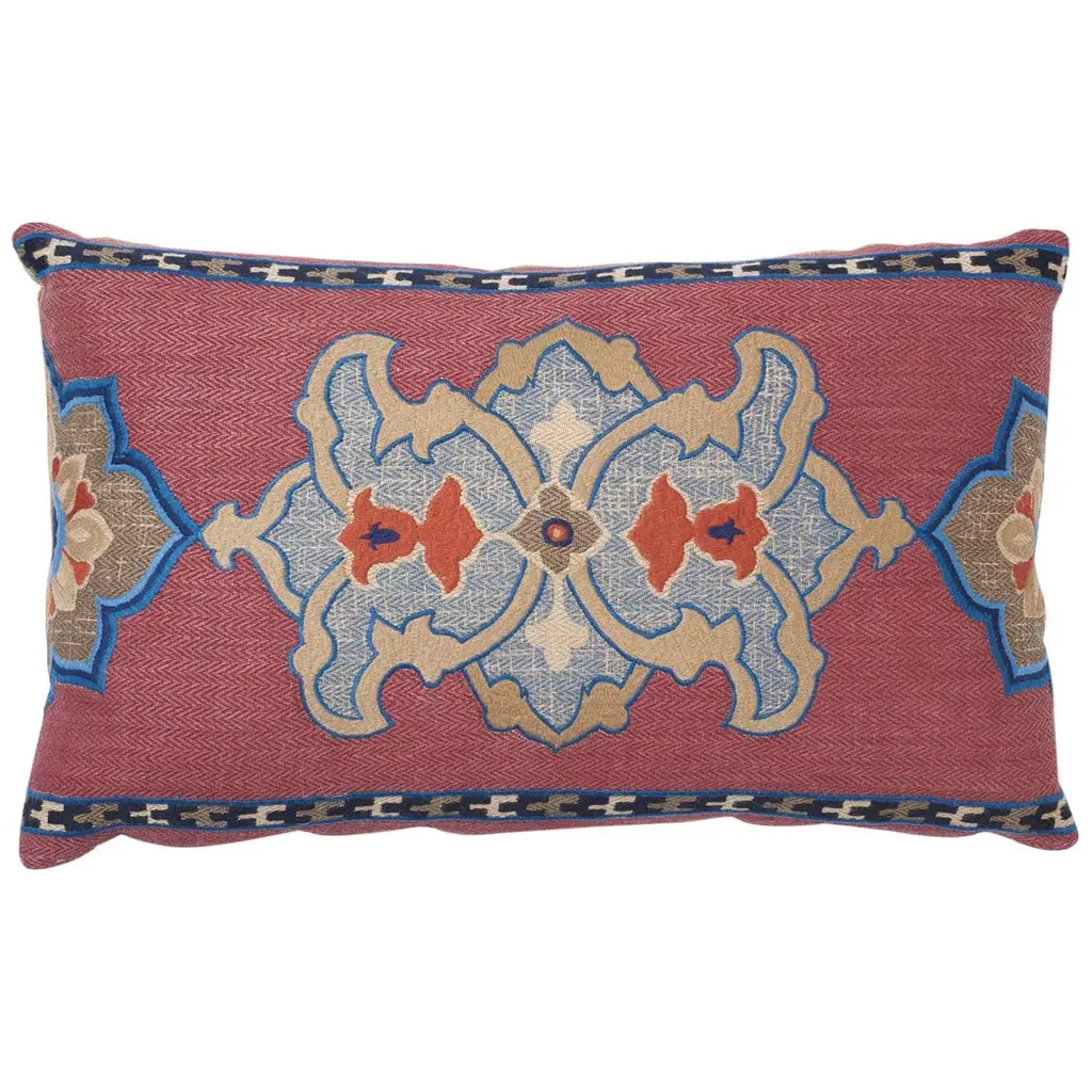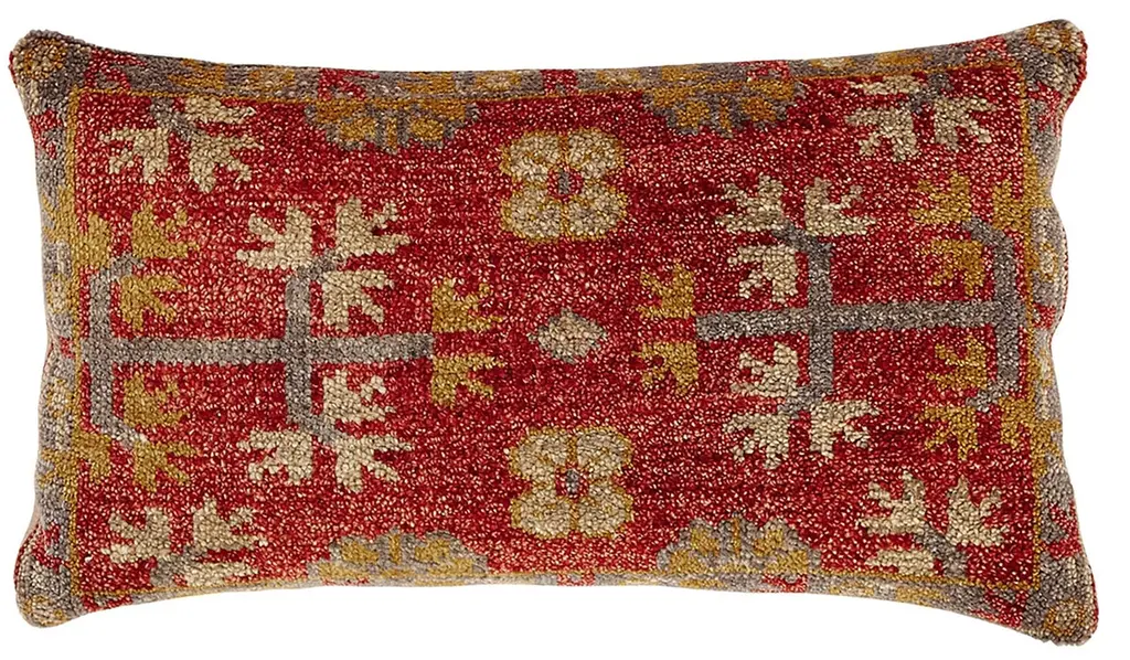 This new accent pillow of East-meets-West design aesthetic showcases a Tibetan design with predominant pimento color.Hand made, using either 100% premium wool.This pillow measure: 22" x 14".