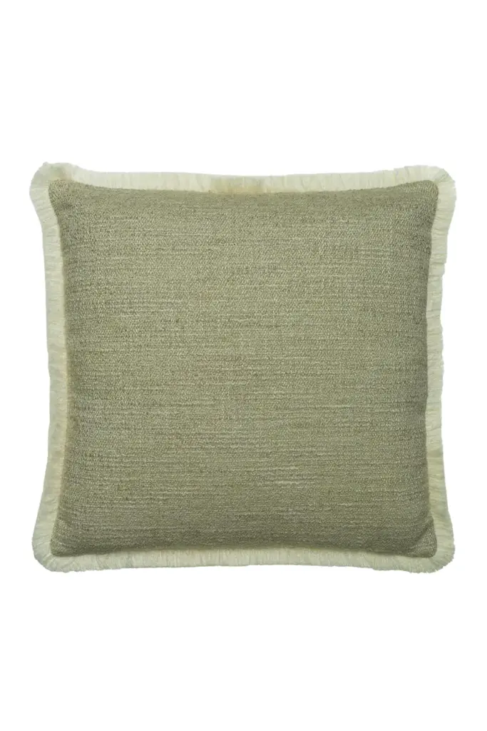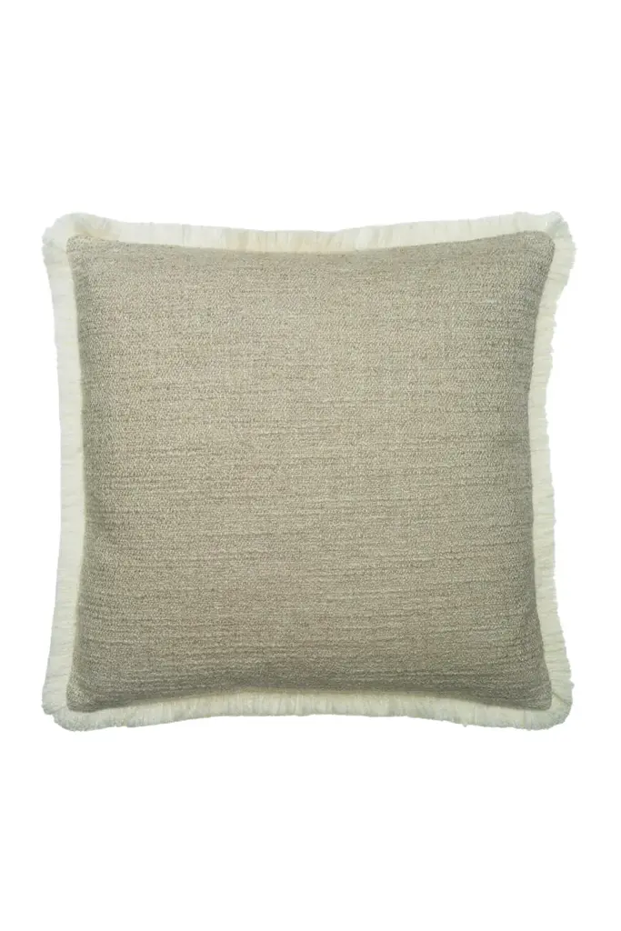 An elegant chalk white cushion made from our Wren fabric, designed in collaboration with interior designer, Sophie Paterson. Wren is an intricately woven fabric consisting of wool, viscose, and linen with a bouclé slub yarn for added texture. A beautiful design that mimics the incredible nest-building skills of this small woodland bird. Finished with Cocktail Vesper fringe for a bright rustic edge, this feather-filled cushion is perfect for mixing with the other colors and prints of the Woodland collection. - White, Light Brown, Gray, Brown, Dark Gray, Green