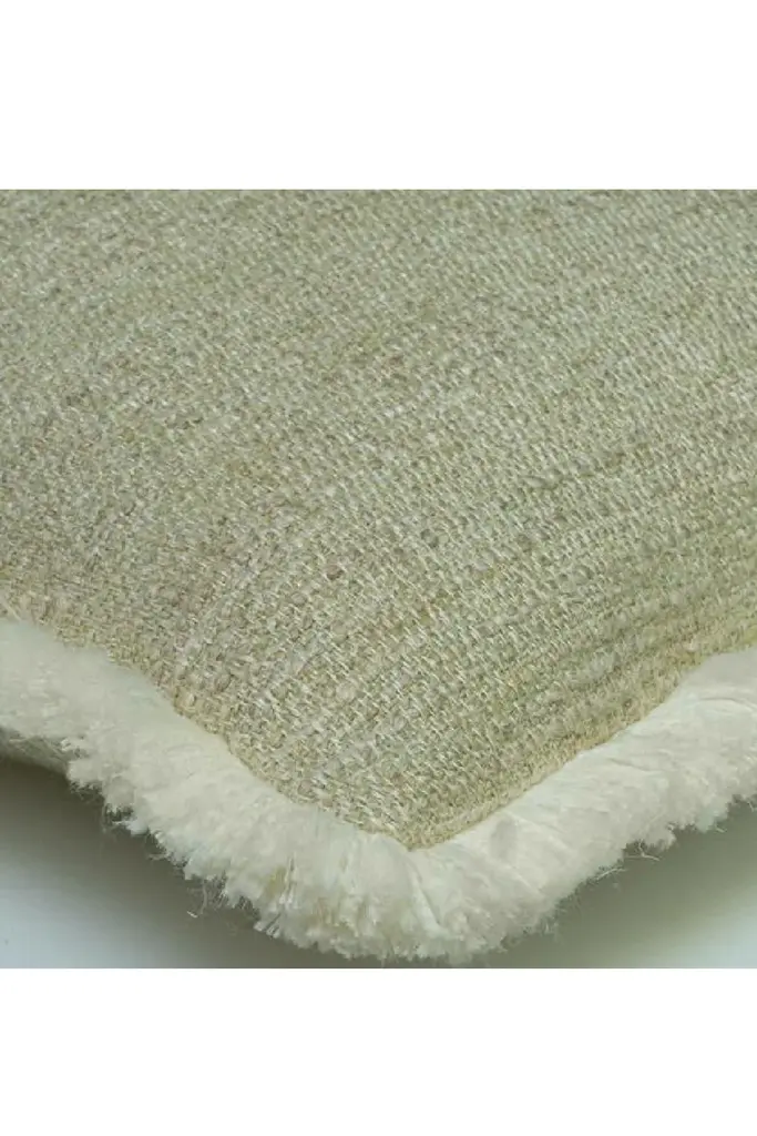 An elegant chalk white cushion made from our Wren fabric, designed in collaboration with interior designer, Sophie Paterson. Wren is an intricately woven fabric consisting of wool, viscose, and linen with a bouclé slub yarn for added texture. A beautiful design that mimics the incredible nest-building skills of this small woodland bird. Finished with Cocktail Vesper fringe for a bright rustic edge, this feather-filled cushion is perfect for mixing with the other colors and prints of the Woodland collection. - White, Light Brown, Gray, Brown, Dark Gray, Green