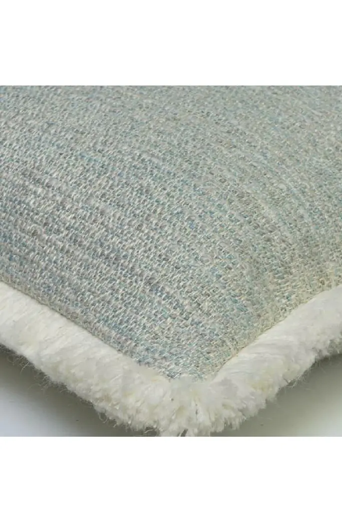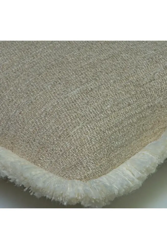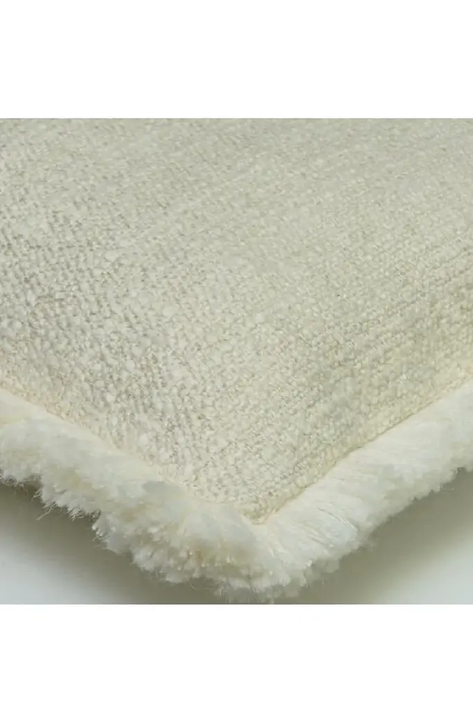 An elegant chalk white cushion made from our Wren fabric, designed in collaboration with interior designer, Sophie Paterson. Wren is an intricately woven fabric consisting of wool, viscose, and linen with a bouclé slub yarn for added texture. A beautiful design that mimics the incredible nest-building skills of this small woodland bird. Finished with Cocktail Vesper fringe for a bright rustic edge, this feather-filled cushion is perfect for mixing with the other colors and prints of the Woodland collection. - White, Light Brown, Gray, Brown, Dark Gray, Green