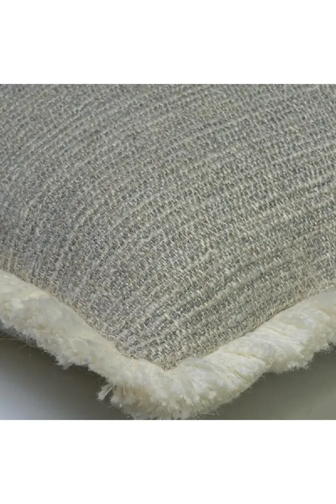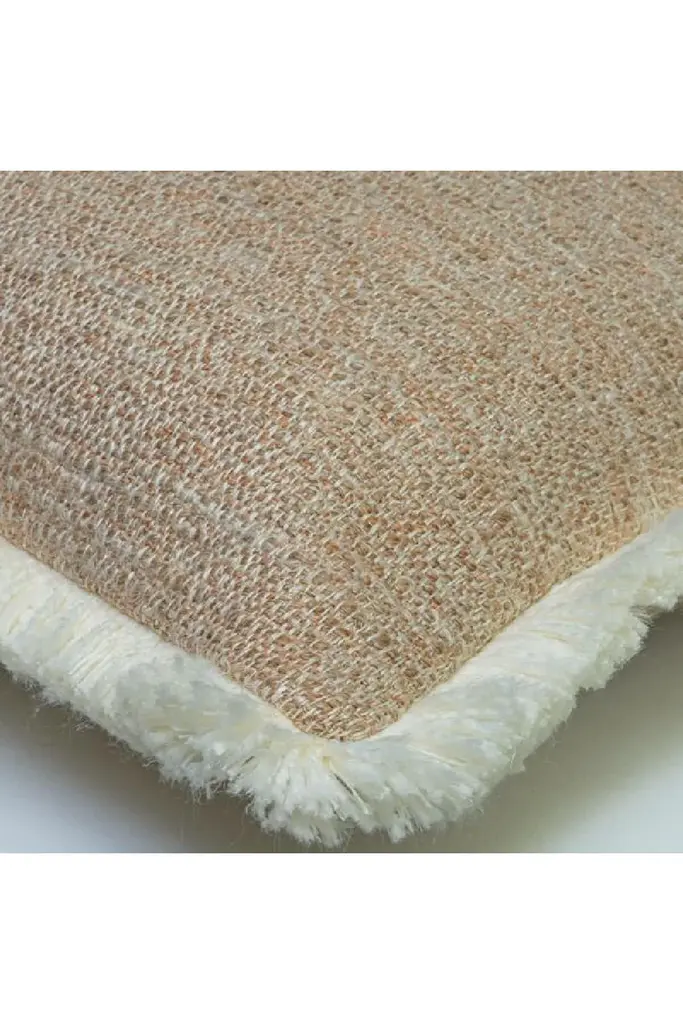 An elegant chalk white cushion made from our Wren fabric, designed in collaboration with interior designer, Sophie Paterson. Wren is an intricately woven fabric consisting of wool, viscose, and linen with a bouclé slub yarn for added texture. A beautiful design that mimics the incredible nest-building skills of this small woodland bird. Finished with Cocktail Vesper fringe for a bright rustic edge, this feather-filled cushion is perfect for mixing with the other colors and prints of the Woodland collection. - White, Light Brown, Gray, Brown, Dark Gray, Green