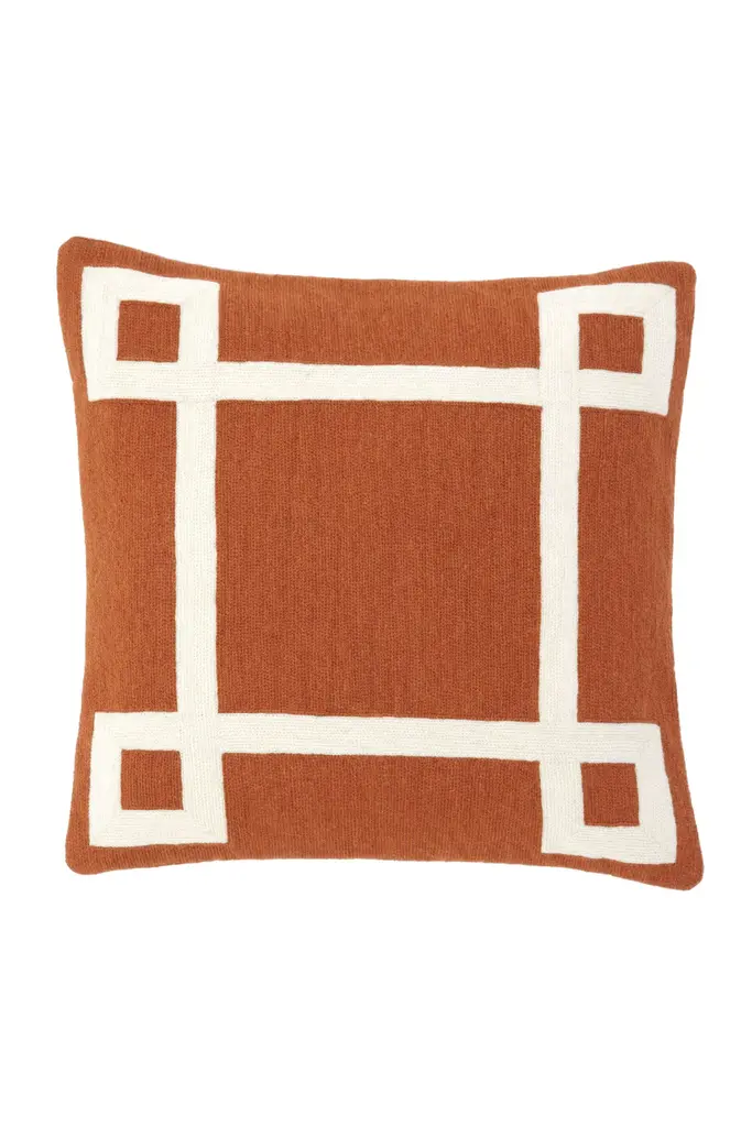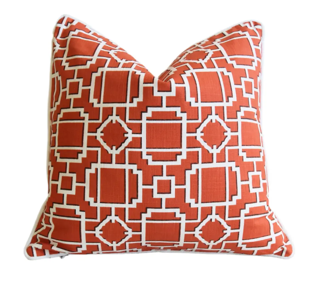 Custom-tailored designer geometric lattice cotton blend fabric pillow Same fabric on the reverse. Custom cord trim. Zipper closure. New plump goose feather-and-down insert. Excellent new, unused condition!!