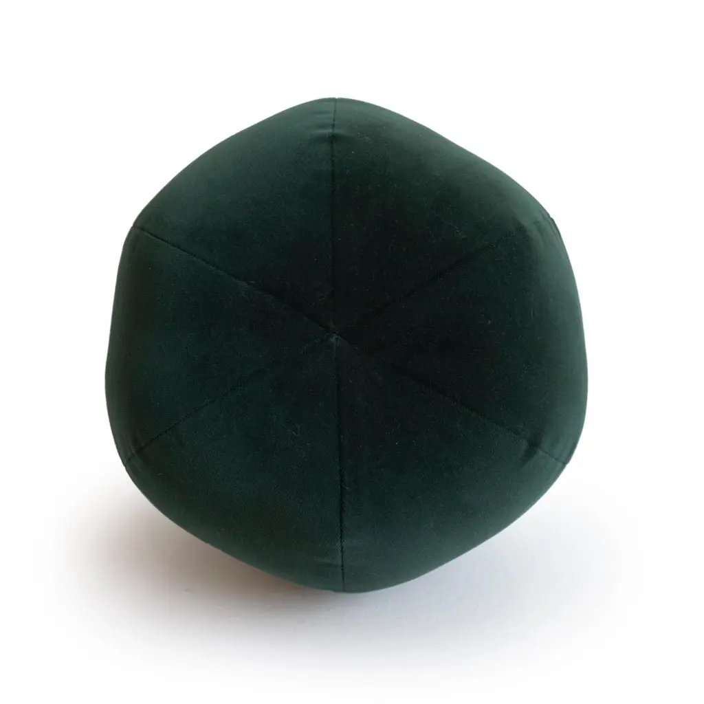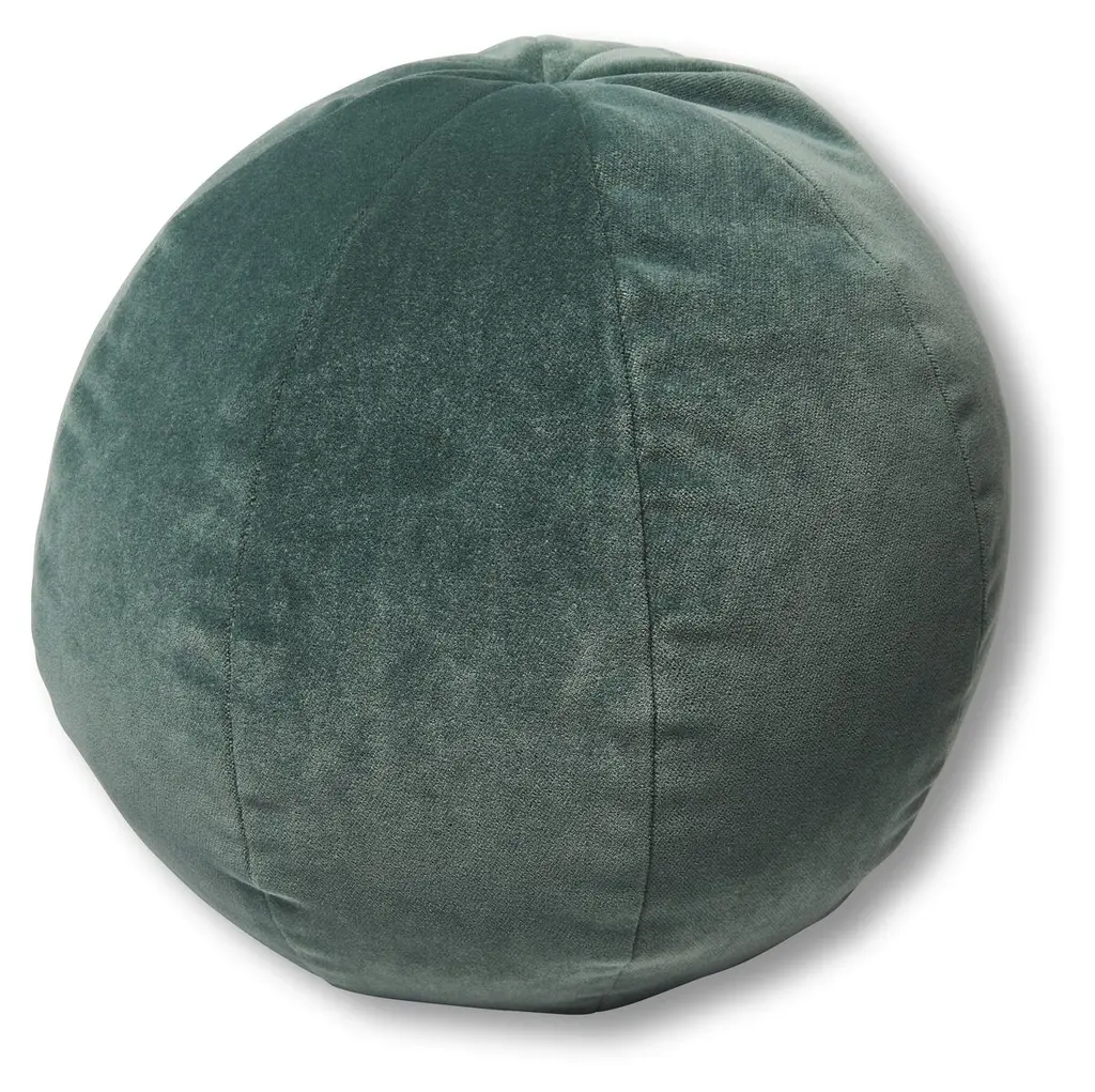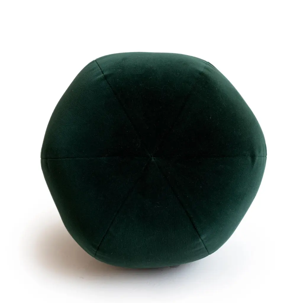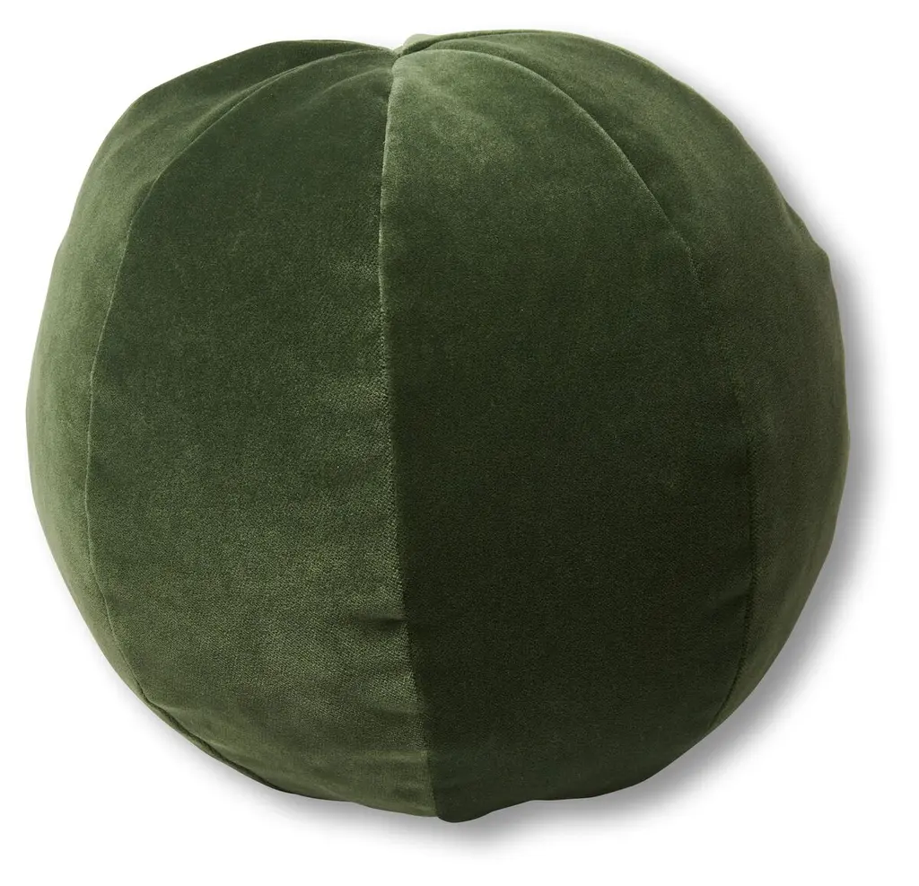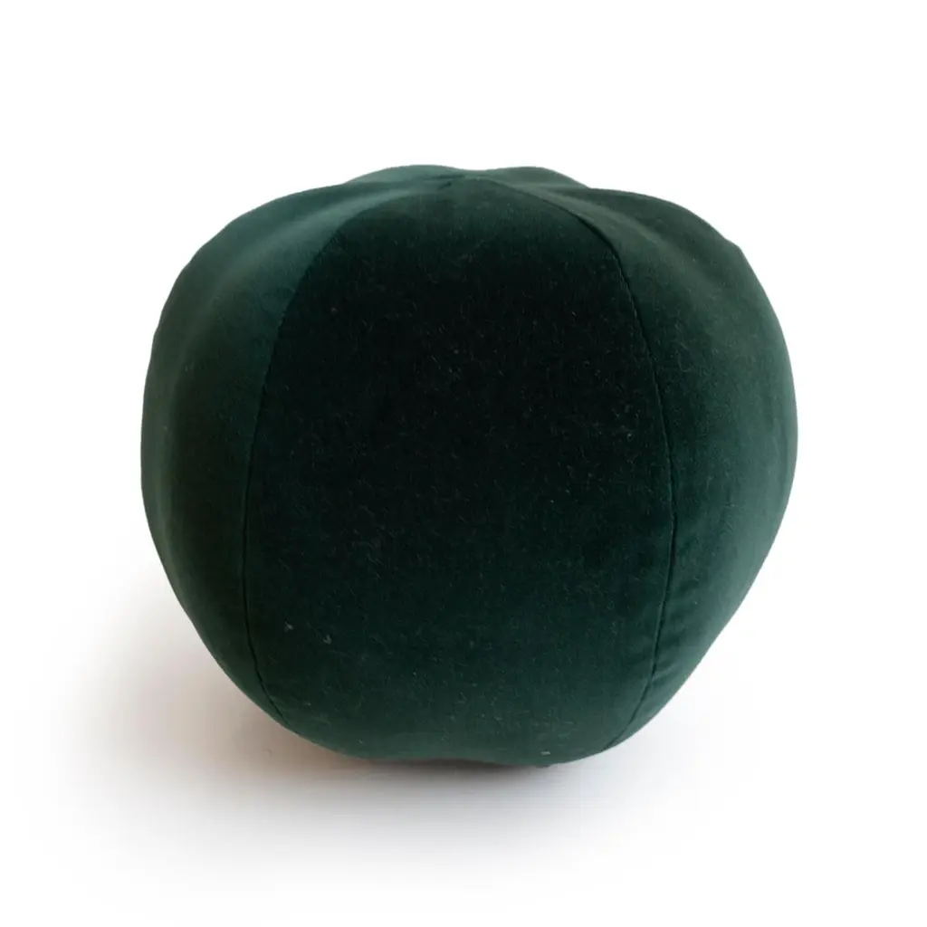This round ball throw pillow was hand sewn at studio in Norwalk, CT. The pillow is made with a soft forest green velvet.Measurements: 9" height x 12" diameter.Disclaimer: Due to their handcrafted nature, the final size and shape of our Ball Pillows may vary depending on the materials chosen for fabrication.