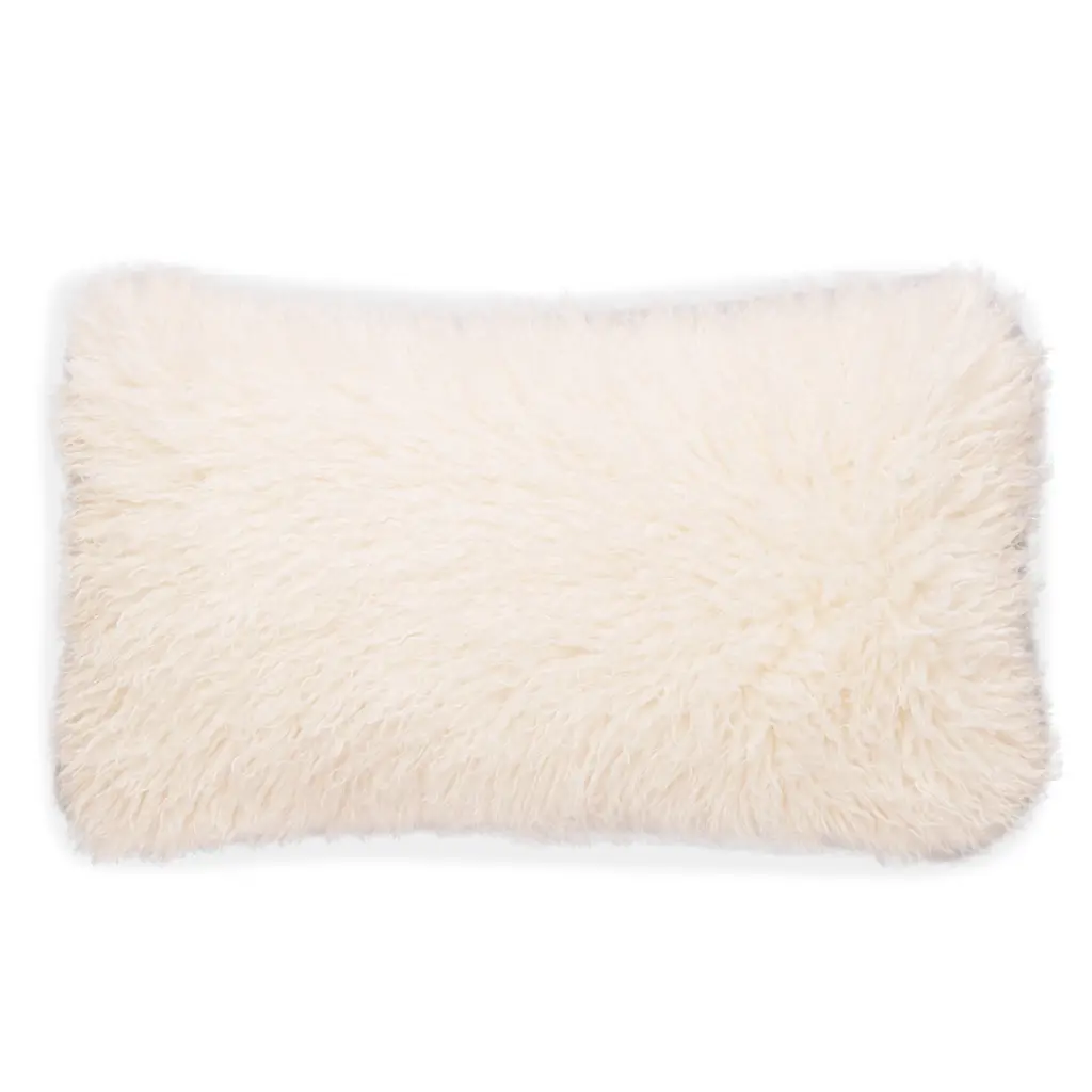 This natural white 12x24 rectangular pillow is made from Mongolian sheep's wool and is backed by an ultra-soft, faux suede in a matching shade. The delightfully soft texture of this exclusive wool creates a powerful visual statement. Lifted by the slightest breeze the incredibly soft hairs dance lightly, entrancing any passerby. Its touchable and inviting look will add a dynamic yet soft and approachable element to your space. This natural wool pillow's generous proportion and amazing texture make it a center piece to any room. Size: 12"x24" Rectangular Front : 100% Mongolian Sheepskin in Natural White Back: Soft faux suede in matching color Color matched concealed zipper closure Dry Clean Only