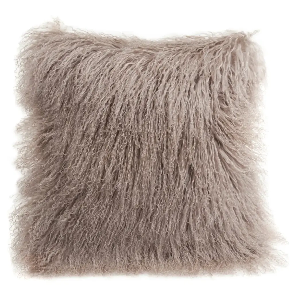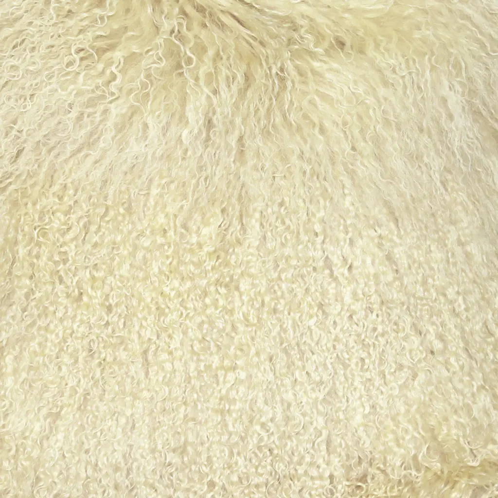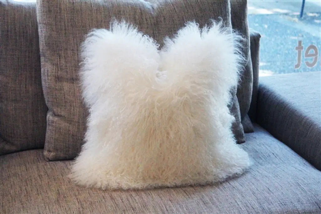 This natural white Mongolian pillow is made from Mongolian sheep's wool and is backed by an ultra soft faux suede in a matching color. The delightfully soft texture of this exclusive wool creates a powerful visual statement. Lifted by the slightest breeze the incredibly soft hairs dance lightly, entrancing any passerby. Its touchable and inviting look will add a dynamic yet soft and approachable element to your space. This natural wool pillow's generous proportion and amazing texture make it a center piece to any room. Size: 18"x18" Square Front : 100% Mongolian Sheepskin in Natural White Back: Soft faux suede in matching color Color matched concealed zipper closure Dry Clean Only