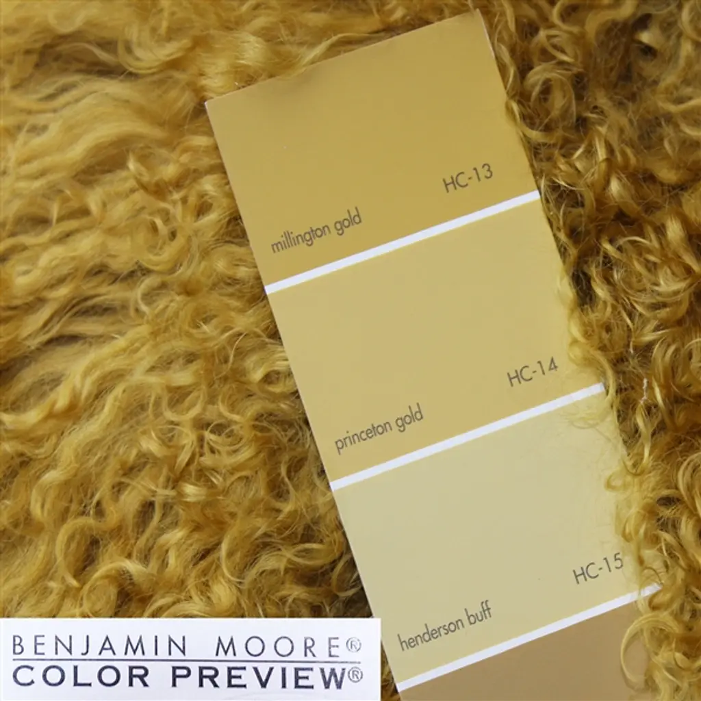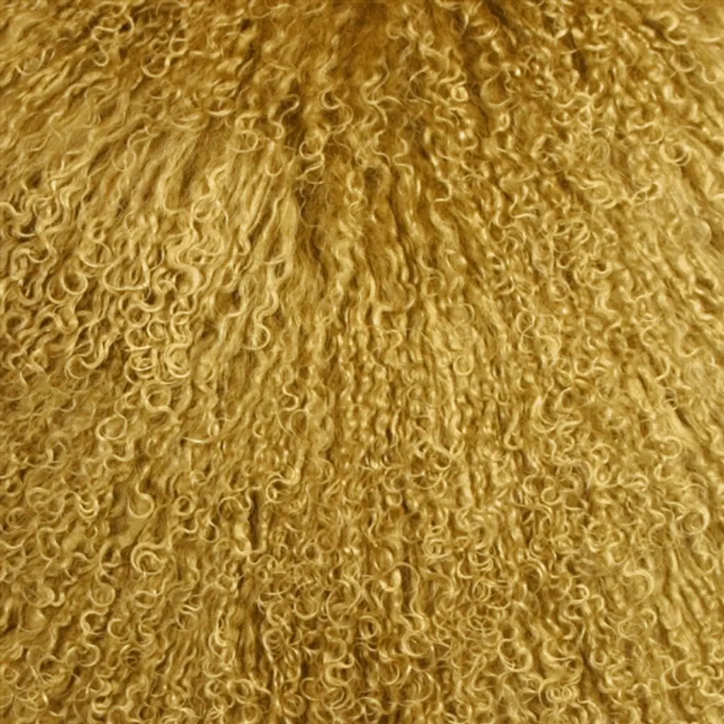 This Soft Gold Mongolian pillow is a genuine sheepskin pillow and is backed by an ultra soft faux suede in a matching tone. The color is a soft, dusty gold and a very close match to Millington Gold (HC-13) from Benjamin Moore's Color Preview Palette. The delightfully soft texture of this exclusive wool creates a powerful visual statement and its touchable and inviting look will add a dynamic yet soft and approachable element to your space. Size: 18"x18" Square Front: 100% Mongolian Sheepskin in Deep Mustard Yellow Back: Soft faux suede in matching color Color matched concealed zipper closure Dry Clean Only