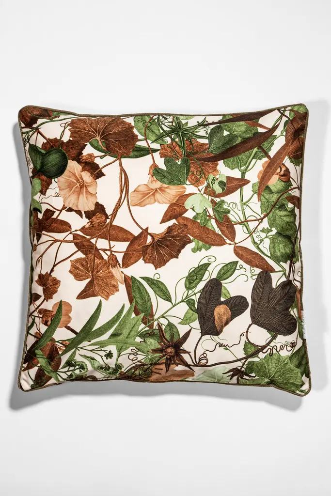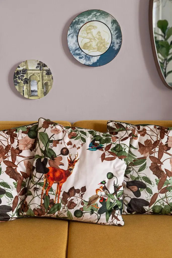 This delightfully elegant Mont Blanc pillow will enhance any classic style sofa with the intricately design of plants and mountain animals, immersed in shades of autumnal colors. Sophisticated and detailed in its design, the Mont Blanc range of cushions has been inspired by the world of hunting.Pillow 2/6.