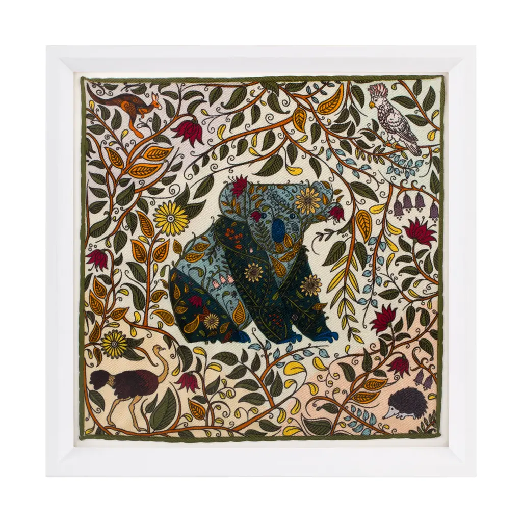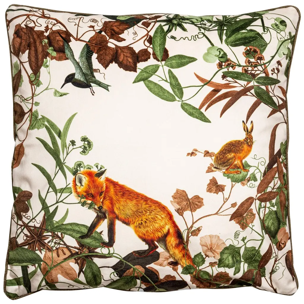 Ideally paired with other cushions from the same series for an assorted look, this fluffy piece exemplifies the storytelling value of trip-inspired designs by Vito Nesta. The soft cover in white polyester velvet is exquisitely printed with a striking frame consisting of green and brown foliage, which is combined with a fox, a hare, and a black bird with unfurled wings for a splendid interplay of flora and fauna.