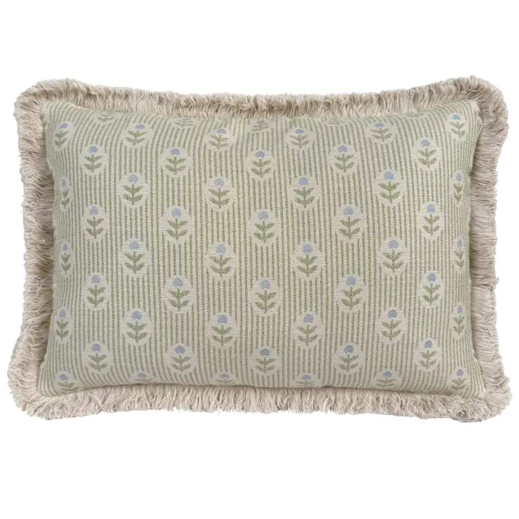 Indian block prints are a favorite of top designers because they look forever fresh and pair so well with other patterns and colors. Our Montrose Taupe Sunbrella Fringed Outdoor Pillow captures the go-to look in legendary Sunbrella Performance Fabric. The small-scale green and white floral motif is woven in a basketweave of invitingly soft, taupe acrylic to resist stains and fading. A feathery white Sunbrella® fringe adds soft texture. We love this indoor-outdoor throw pillow in spaces where kids, pets and spills gather, from the kitchen and breakfast nook to the porch and patio. Montrose Taupe Sunbrella Fringed Outdoor Pillow features: