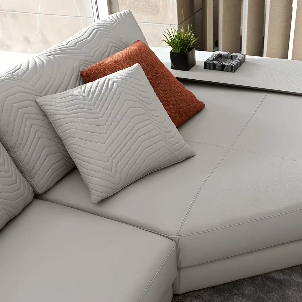Quilted square pillow available in first-grade leather, nubuck leather, lizard printed leather, velvet, or suede fabric. Pillow in down feather.