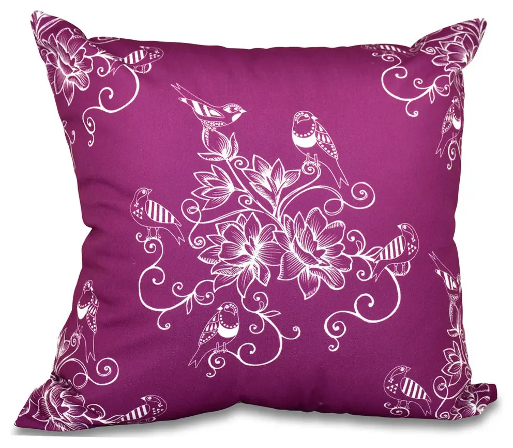 Morning Birds, Floral Outdoor Pillow, Purple, 18"x18"