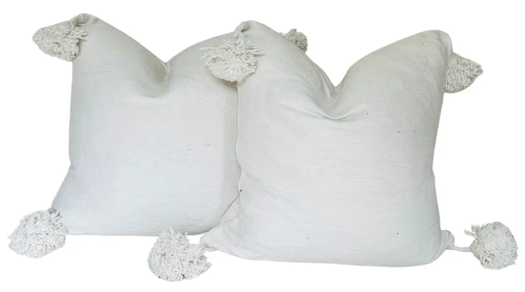 Pair of Moroccan handloomed cotton pom pom pillows with zipper closure New duck feather-and-down fill inserts. Due to hand-made nature of each piece, no pillow is the exact same in design or size. Some loose strings, original to piece.